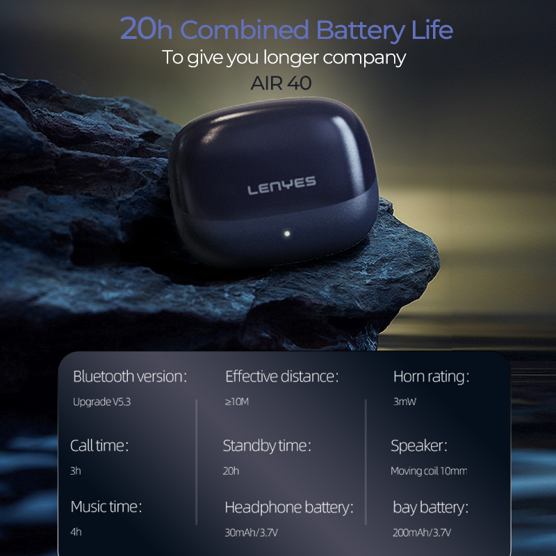 Experience uninterrupted music and calls with up to 20 hours of playtime on a single charge, thanks to the powerful 30 mAh battery in each earbud. Equipped with Bluetooth v5.3 for seamless connectivity and a sensitivity of 90 dB, these earbuds deliver clear, high-quality sound in a sleek black or white design. Discover how the Lenyes Air 40 TWS can elevate your audio experience with reliable performance and comfort.