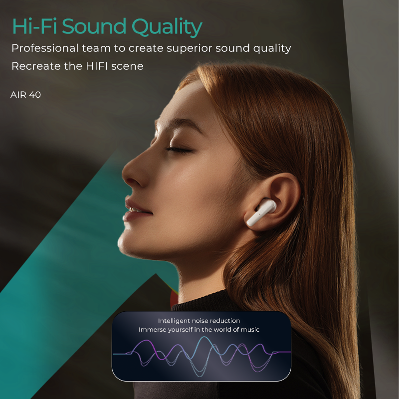 AIR40 earbuds provide a high-quality listening experience with HiFi bass, 20-hour battery life, and Bluetooth 5.3. Features include touch controls, instant pairing, and voice assistant support. With 90dB sensitivity and 2 colour options, it’s ideal for both calls and music on the go.