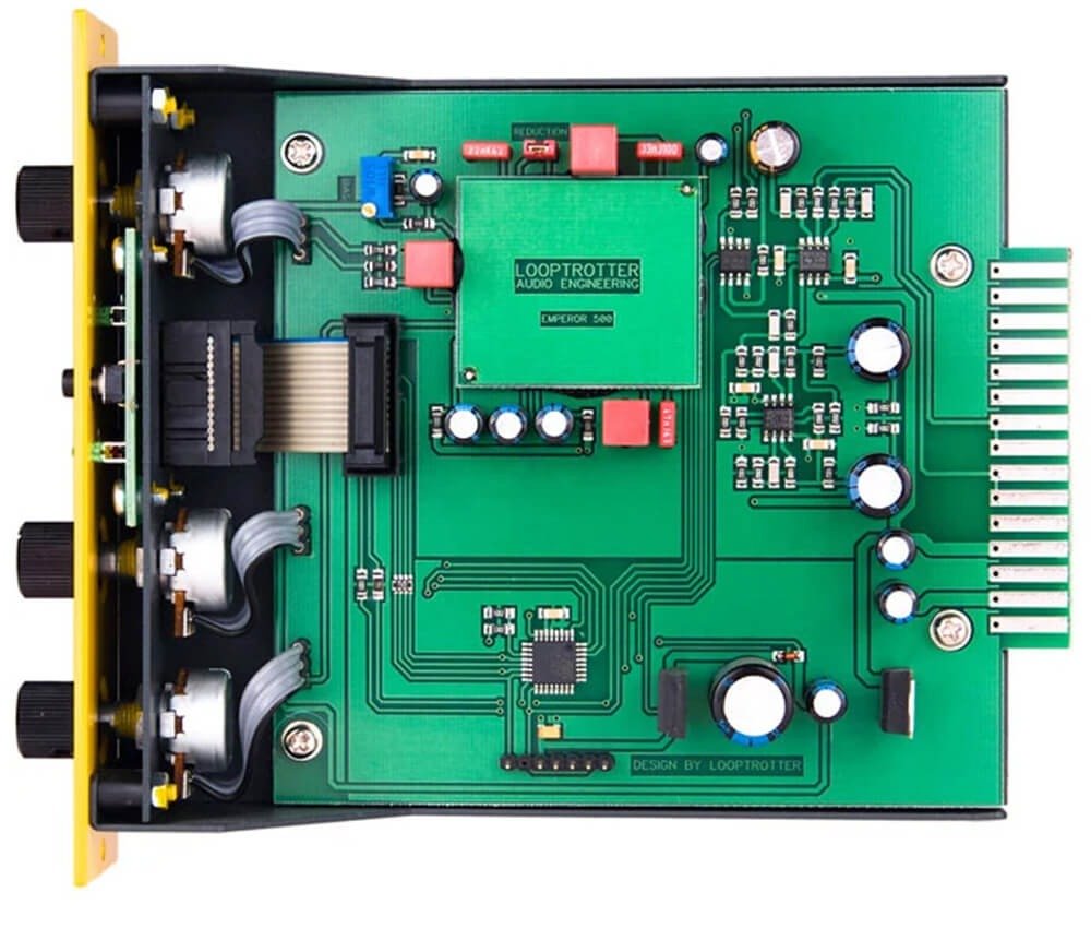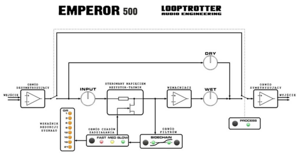 LOOPTROTTER EMPEROR 500 is an analog dynamics processor, which depending on the settings, can work as a compressor, limiter or harmonics distortion generator. It’s design was inspired by limiters and transistor compressors from the 1960-ties. It uniquely enhances perceived loudness, warms up and brightens the audio signal in a very ear pleasant way.