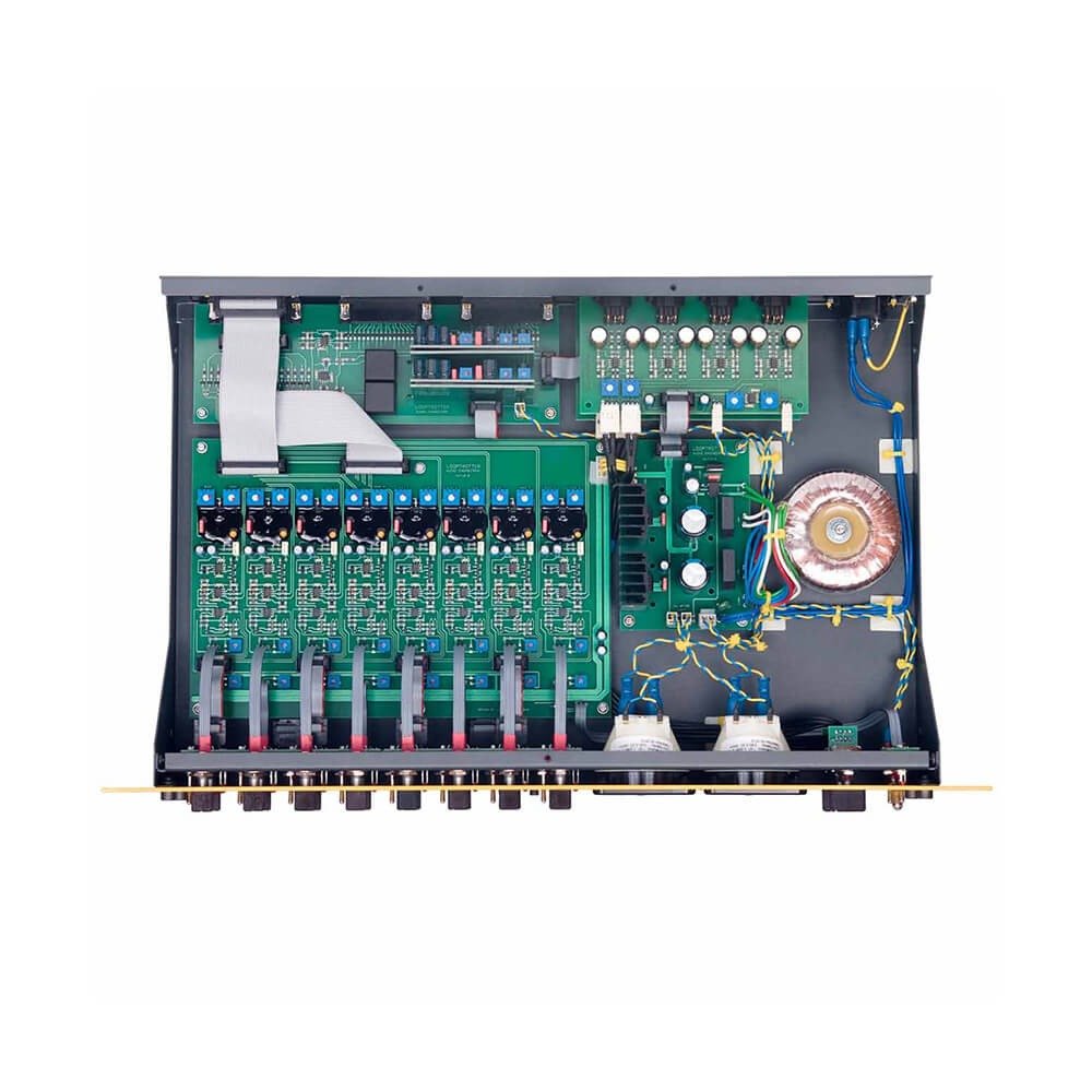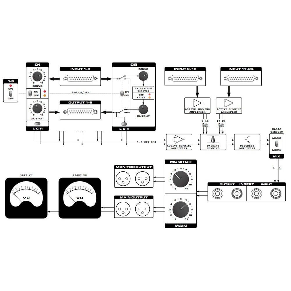 The summing module is an originally designed combination of operational amplifiers and both, active and passive voltage summing. The mixed signal is amplified by a transistor preamplifier operating in pure Discrete Class A. Additionally, the summing circuit is fitted with the “Magic” module, which warms up and opens the whole mix, giving it a vivid, analog feel. This feature is very desired in modern production which is dominated by digitally generated sounds. SATUR-8/24 is very versatile and creative tool for processing of tracks, subgroups and the entire mix.