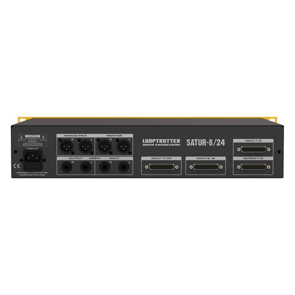 The Looptrotter Satur 8/24 utilizes balanced XLR connections for Monitor and Main Output, balanced TRS for Insert input and Output and DB25 for the channel input/output. The unit may not only be used as a summing mixer but also as a 8 channel saturator for processing stems, track groups or the whole mix, thanks to direct output from 1-8 saturation modules.