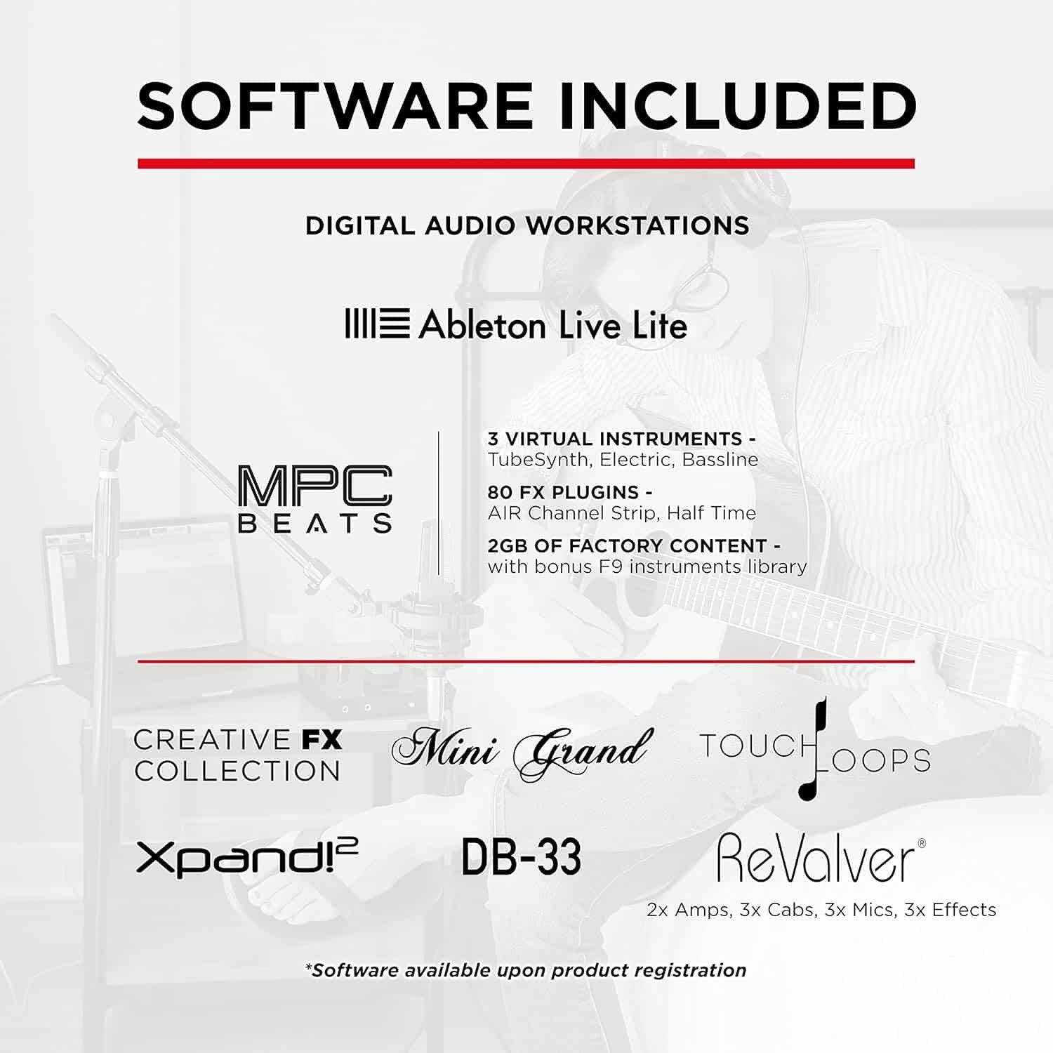 ‎ProTools, First, Ableton Live Lite, Eleven Lite, Avid FX Collection and Touch Loops content, Creative FX Collection, Xpand!2, Mini Grand, Vacuum, DB33, BOOM VIs