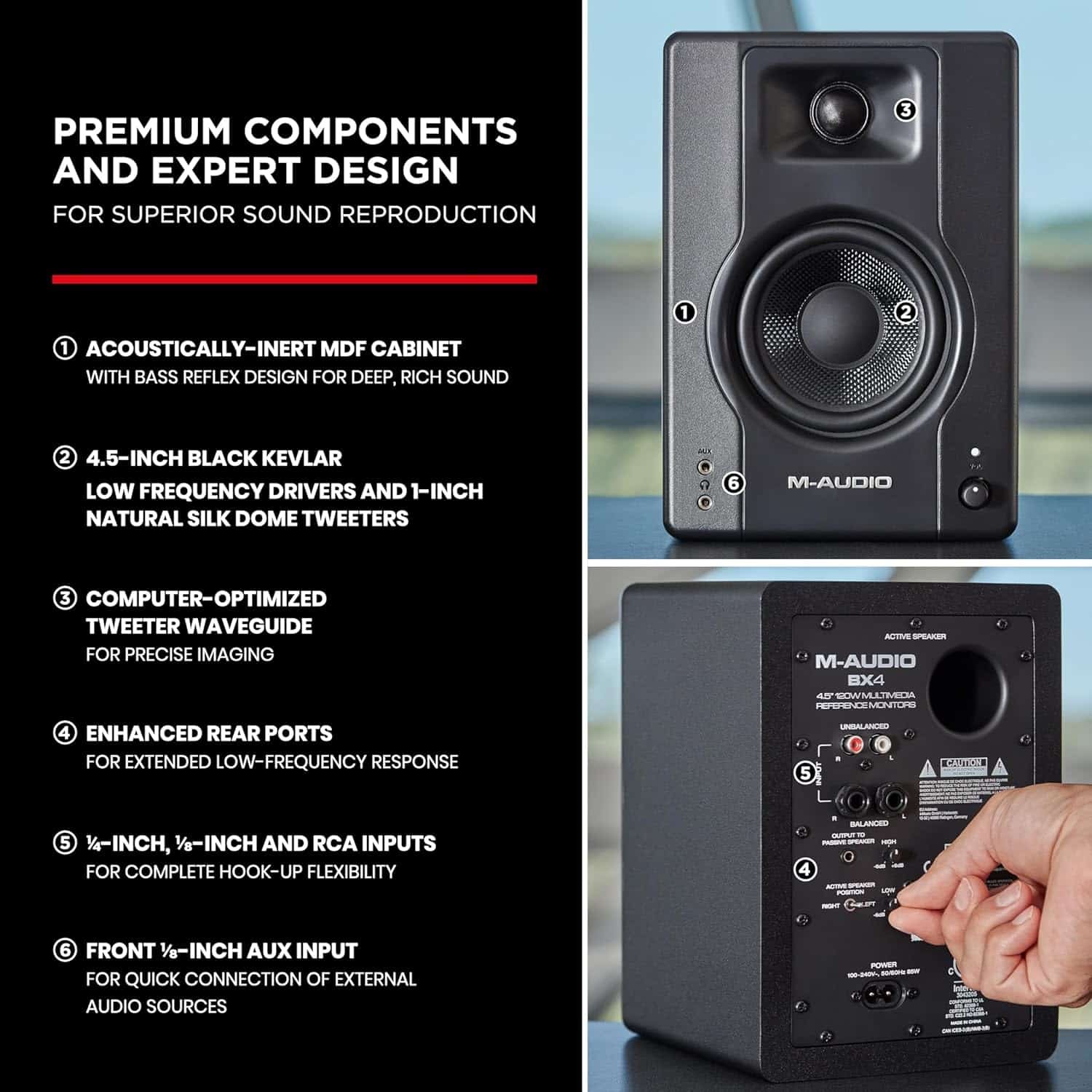 Upgrade Your Desktop Speaker Sound With BX4’s Studio Monitor Quality Are you unhappy with the sound quality of your built-in computer speakers? The M-Audio BX4 speakers are the perfect choice! Compact, attractive and simple-to-install, M-Audio’s BX4 desktop speakers have been meticulously created for you to experience your media like never before! Immersive Listening Experience Designed for live streaming, podcasting, gaming, watching movies or listening to your favorite music, M-Audio’s BX4 speakers provide and impressive 120 Watts of crystal-clear sound inside an attractive, style-driven design. The two-way desktop speaker design features an Acoustically-inert MDF cabinet with bass reflex that facilitates a smooth low end and punch through the Kevlar® low frequency drivers. Plus, the enhanced rear ports add extended low-frequency response making any videogame, movie or song you play a truly immersive experience. Add to this, the computer-optimized natural silk dome tweeters for a crystal clear high-end and precise stereo image, and the BX4 delivers pristine sound quality perfect for any multimedia application. Perfect Connections The rear panel connections offer 1/4”, 1/8”, and RCA inputs making them compatible with all your gear. There is even an 1/8-inch aux input and headphone connection on the front of the speaker for your tablet, computer, or mobile device. What’s In The Box BX4 Speakers (Stereo Pair: 1 Passive Speaker and 1 Active Speaker) Foam Feet 2-Prong IEC Power Cable 1/8” TS Speaker Interconnect Cable 1/8” to 1/8” TRS Aux Cable 1/8” TRS to RCA Cable User Guide Safety & Warranty Manual.