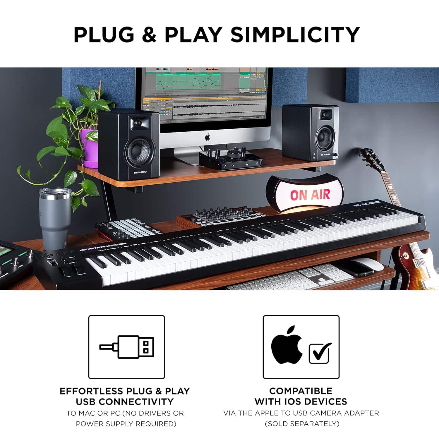 • Music Production Essential – MIDI keyboard controller with 88 full-size velocity-sensitive semi weighted keys for MIDI control of virtual instruments, software samplers and plug-in synthesisers