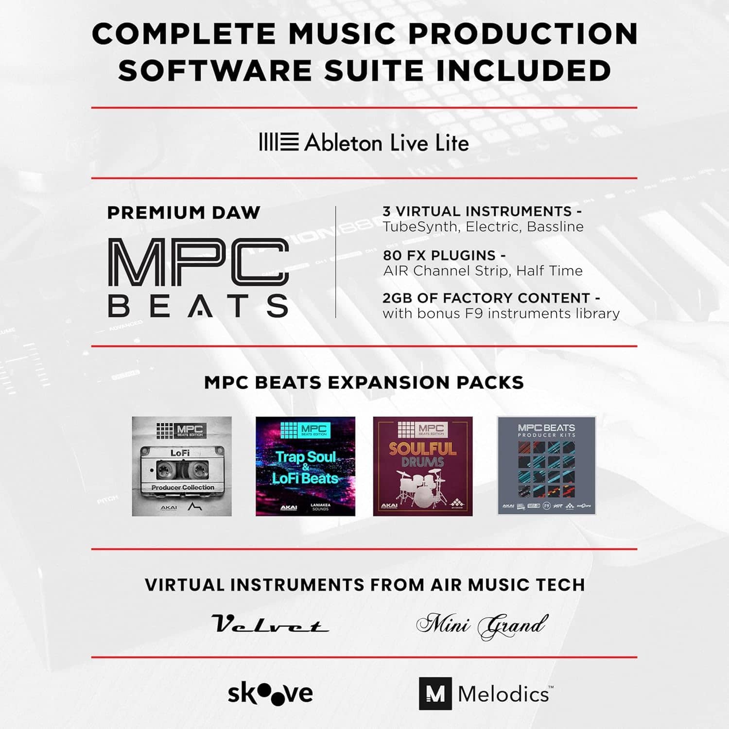 • Everything You Need for Pro Music Production – MPC Beats, Pro Tools First M-Audio Edition, Ableton Live Lite, 6 virtual instruments with 1000+ Sounds and 50+ expertly curated MPC Kits