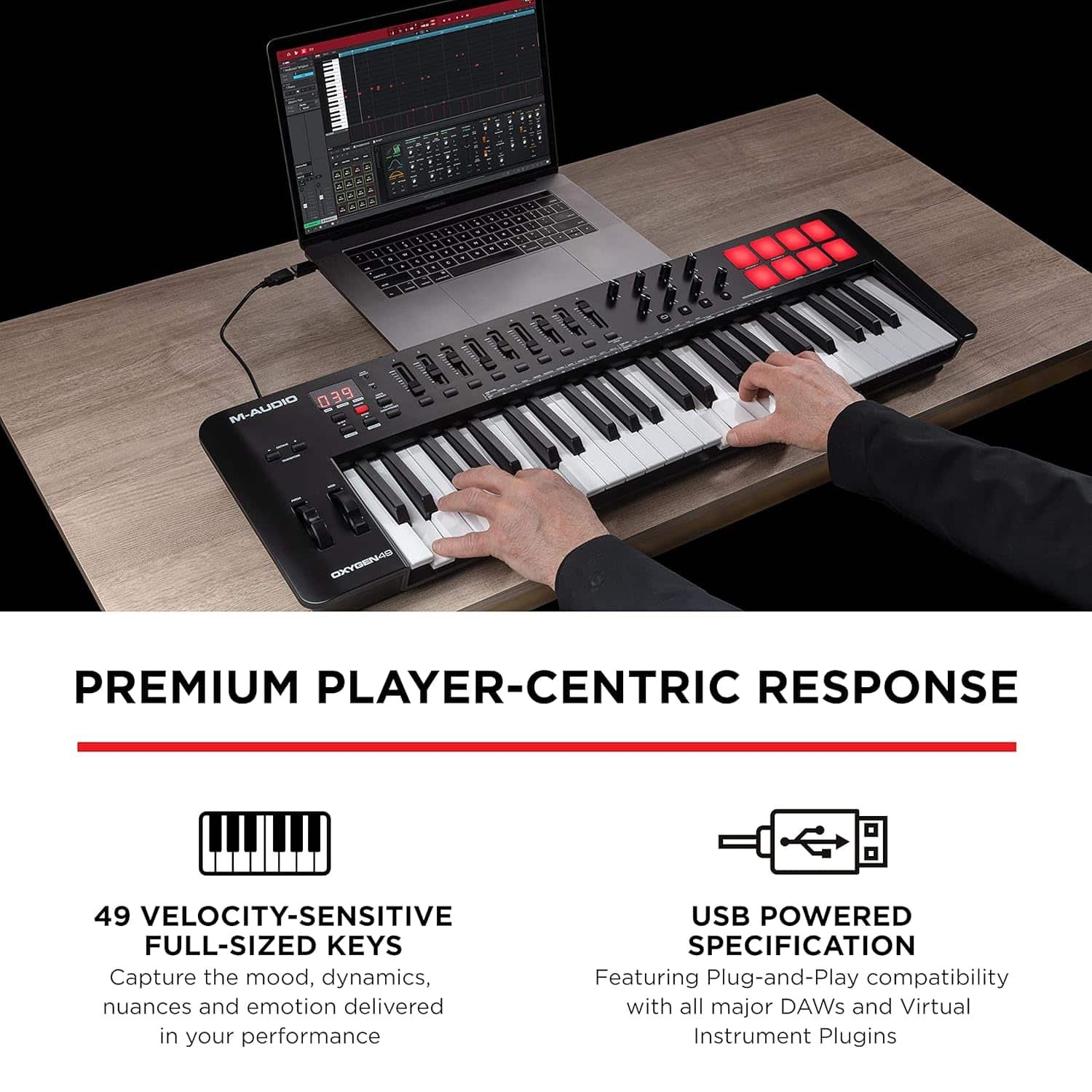 - Recording Studio Equipment Essential – MIDI controller with 49 velocity-sensitive full-size piano style keys delivers a natural response that gets the best from virtual sampler & synthesizer plugins