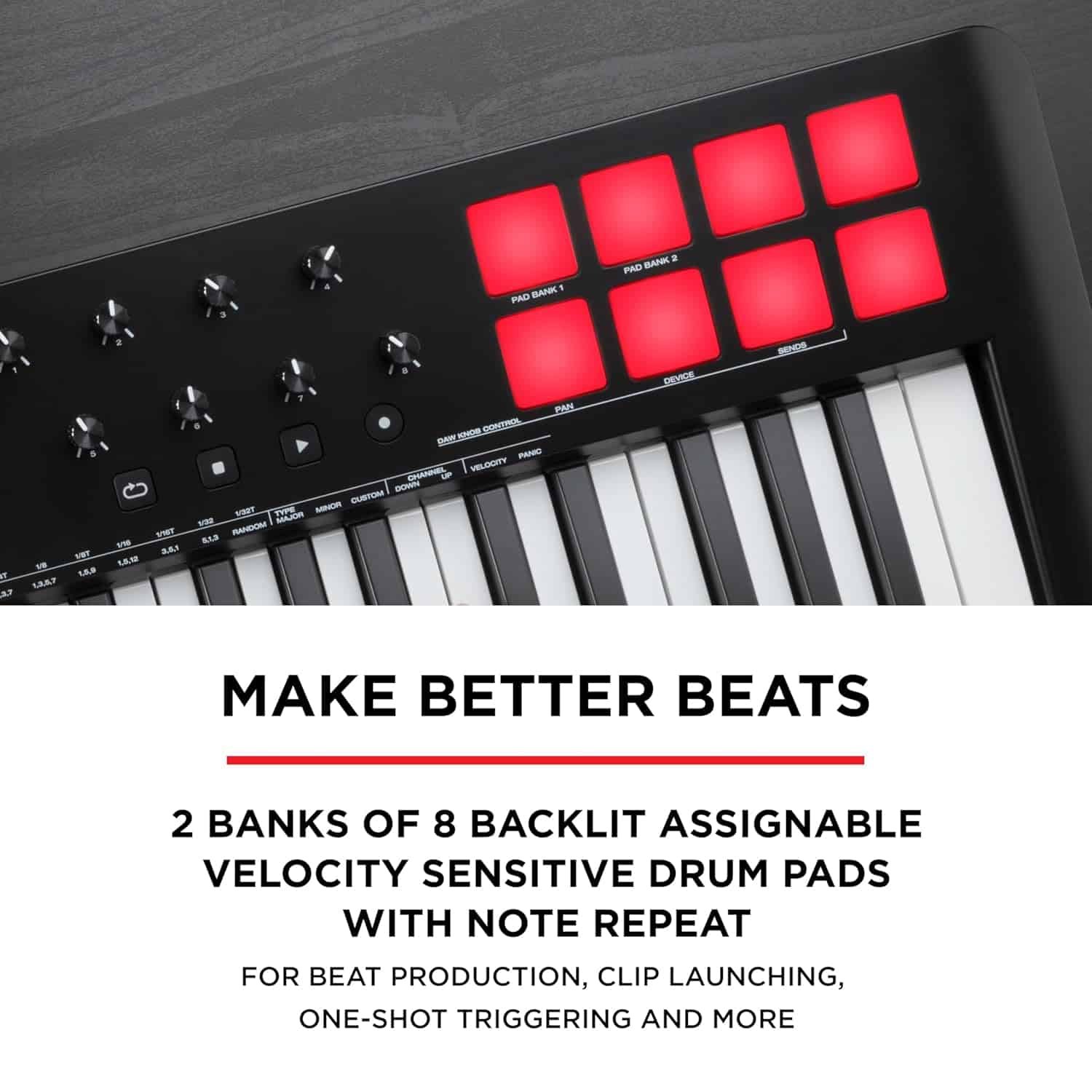 - Make Better Beats with these Beat Maker Must Haves – 2 banks of 8 backlit velocity sensitive drum pads with Note Repeat – for beat production, clip launching, soundboard triggering and more