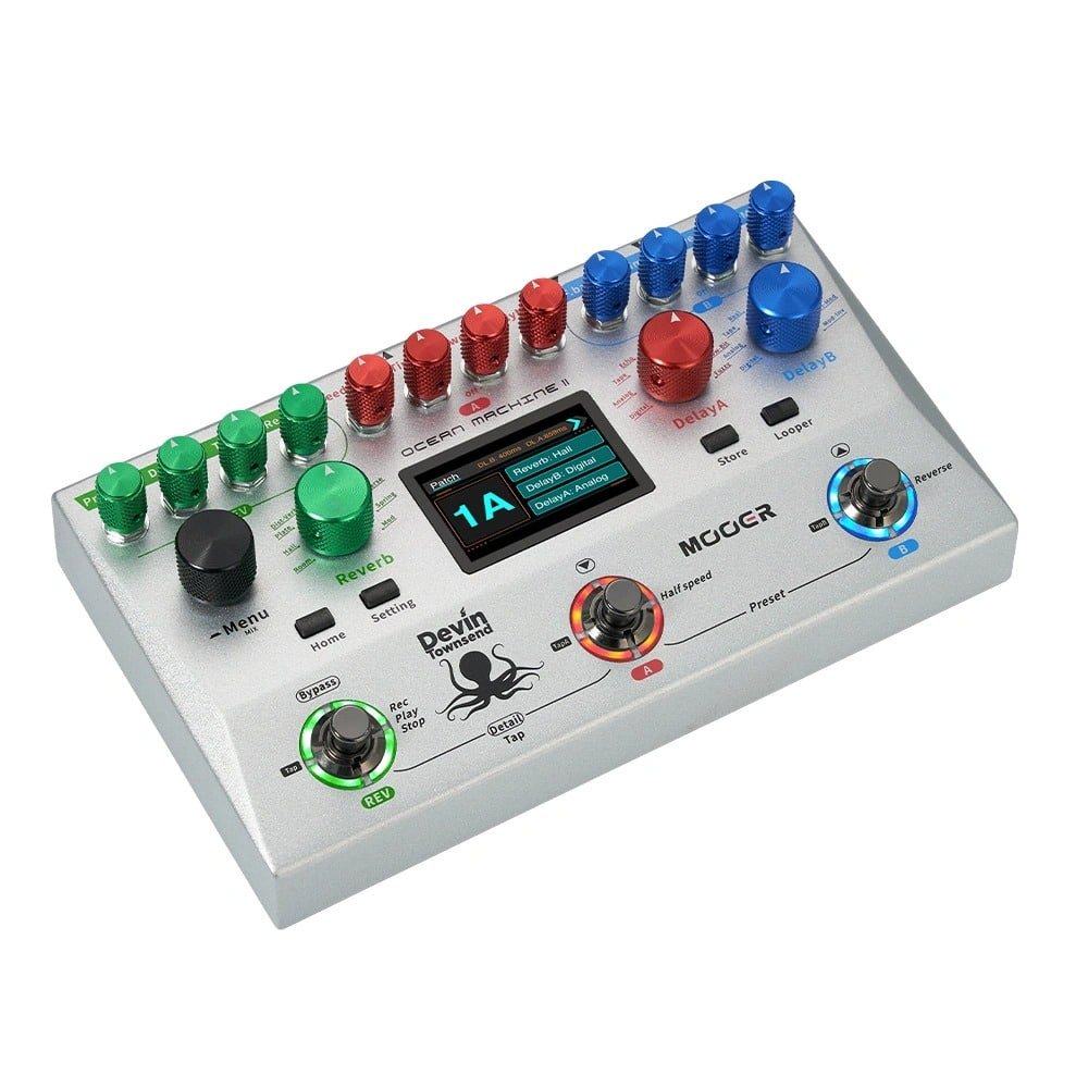 The Mooer Ocean Machine II, co-designed with progressive metal icon Devin Townsend, builds on the original’s legacy with a stunning range of upgraded reverb, delay, and looping features. This second-generation ambient powerhouse is ideal for experimental and atmospheric guitarists looking to craft intricate sonic textures. With two independent delay modules (featuring 9 delay types) and a high-fidelity reverb engine (with 9 lush reverbs and shimmer), the pedal allows for endless layering possibilities. Whether you’re sculpting expansive ambient washes or rhythmic delay trails, the Ocean Machine II gives you complete creative control through a new high-res LCD screen, 12 tactile knobs, and three performance-friendly footswitches. This isn’t just a pedal; it’s a professional-grade ambient effects workstation.
