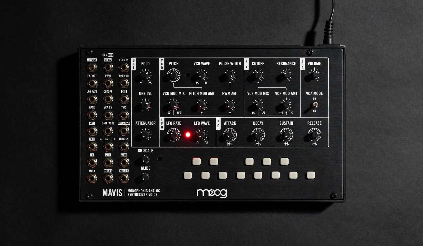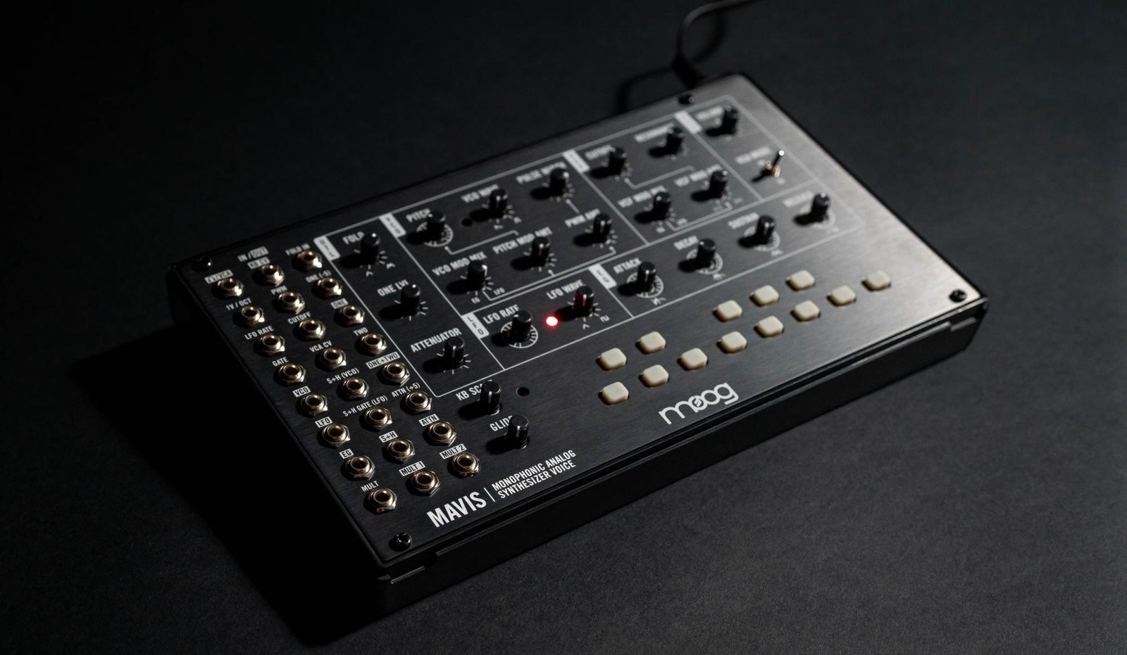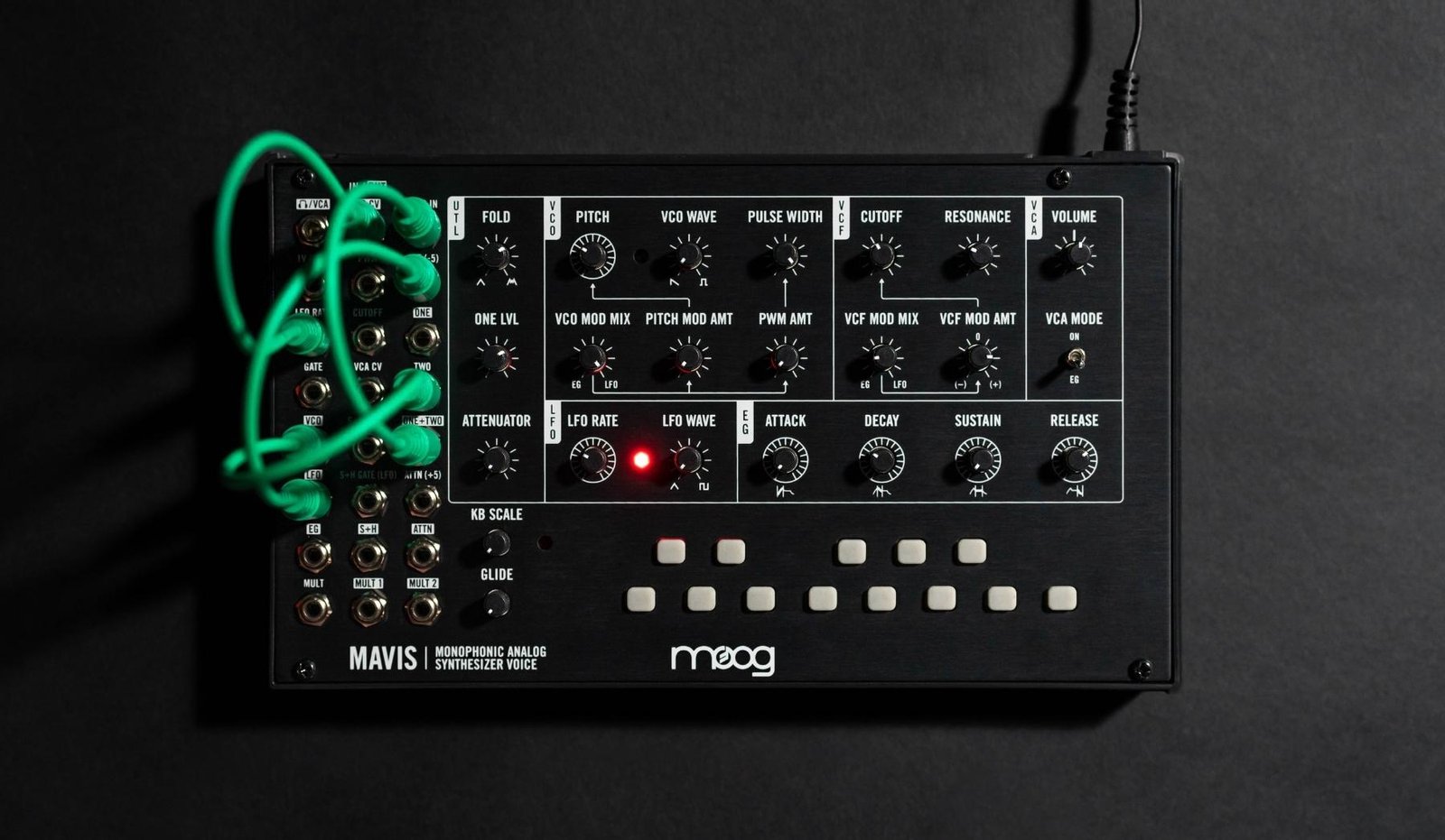 Moog has spared no effort in ensuring the maximum array of analog offerings, despite what the size might suggest. Get to gliding with the expressive 1 v/oct scale and explore unusual pitch relationships, thanks to the KB scale knob and onboard baker’s octave of keys. Build rich harmonic character with the mixable saw/square VCO, which features Pulse Width Modulation to fine-tune your waveform. Harness the power of classic Moog basses and leads with the VCF, a sonic sculpting tool with a -24dB Lowpass Ladder Filter. Moog opted for crossfaders over switches in their modulation, allowing you to variably shape the LFO, with a 4-stage envelope generator to discover compelling and unexpected modulation contours. Mavis doesn’t stop at Moog-classic subtractive synthesis, however; they’ve also provided an additive synthesis option via a totally analog diode wavefolder, drastically broadening your sonic potential.