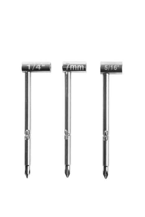 Included in the set is Music Nomad’s custom-designed spoke wheel tool, ideal for truss rods located at the neck heel—especially in models like Music Man and Taylor. It fits into the side spoke holes, making those tricky adjustments cleaner, faster, and safer. You’ll also find a 3/8″ flathead blade that works for heel-adjust truss rods found in many vintage-style guitars. Whether it’s modern or classic hardware, this set has the smart tools to match.