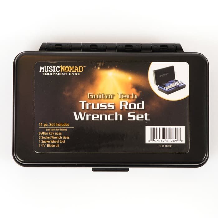 The Music Nomad MN235 Premium Truss Rod Wrench Set is the complete solution for adjusting the neck relief on electric, acoustic, and bass guitars. This 11-piece kit includes 6 Allen key sizes (both SAE and metric), 3 socket wrenches, a spoke wheel tool, and a 3/8” flathead bit—all stored in a durable aluminum case. Whether you’re a tech working across brands or a player managing a growing collection, this set helps you make precise truss rod adjustments quickly and safely—without digging through drawers for the right size.