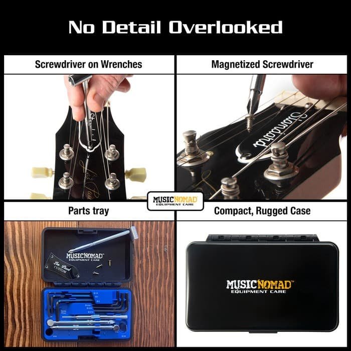 Work on or got a lot of guitars? Stop fumbling around looking for the right wrench for your truss rod adjustment. A must have for every gig bag or work station, MusicNomad’s Premium Guitar Tech Truss Rod Wrench Set offers unmatched versatility and organization in one compact, rugged case. Designed to work on most electric, acoustic, and bass guitars this 11-piece set comes with 6 Allen Key sizes, 3 Socket Wrench sizes, a specially designed Spoke Wheel tool and a 3/8” Blade bit. Bonus features include: laser etched sizes on each wrench, 3 magnetized screwdrivers for small truss rod cover screws and the Socket Wrenches and Spoke Wheel tool slide into MusicNomad’s Octopus handle (sold separately) for additional leverage and comfort. With lots of guitar brands and models out there make sure you check out MusicNomad’s Truss Rod Wrench size by Brand Finder to see a list of over 50 Guitar Brands/Models this kit will work on including Fender, PRS, Gibson, Taylor, MusicMan, Epiphone, ESP, EVH, Gretsch, Guild, Cordoba, Ibanez, Jackson, Knaggs, Charvel, Bourgeois, Takamine, Yamaha to name a few and the very few it does not work on (mostly acoustics that the truss rod is recessed deep in the soundhole). That’s MusicNomad quality – raising the bar in equipment care.