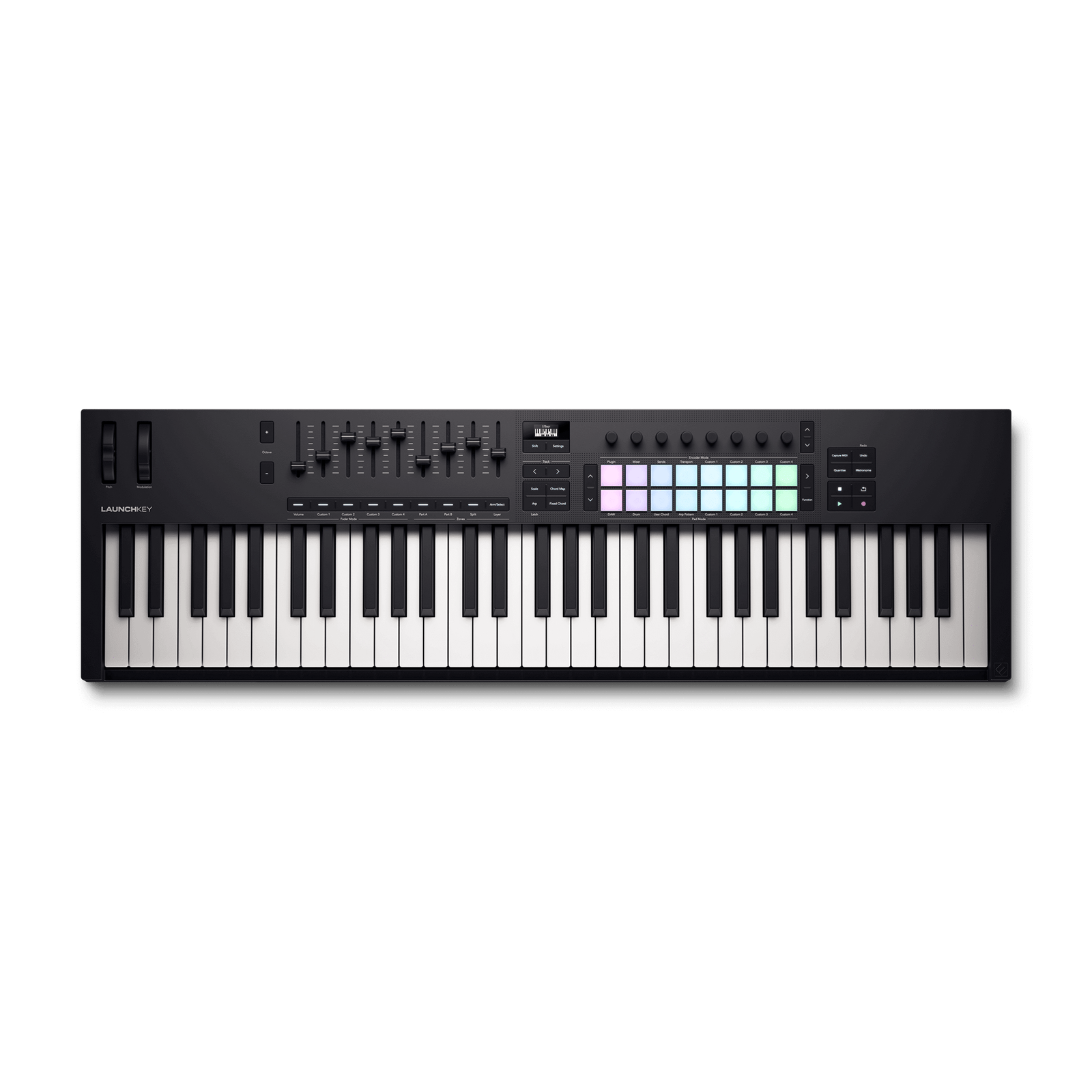 Launchkey 61 is a powerful DAW controller featuring a premium semi-weighted keybed, eight continuous encoders, nine faders, and 16 velocity-sensitive pads for playing drums, instruments, and launching clips.