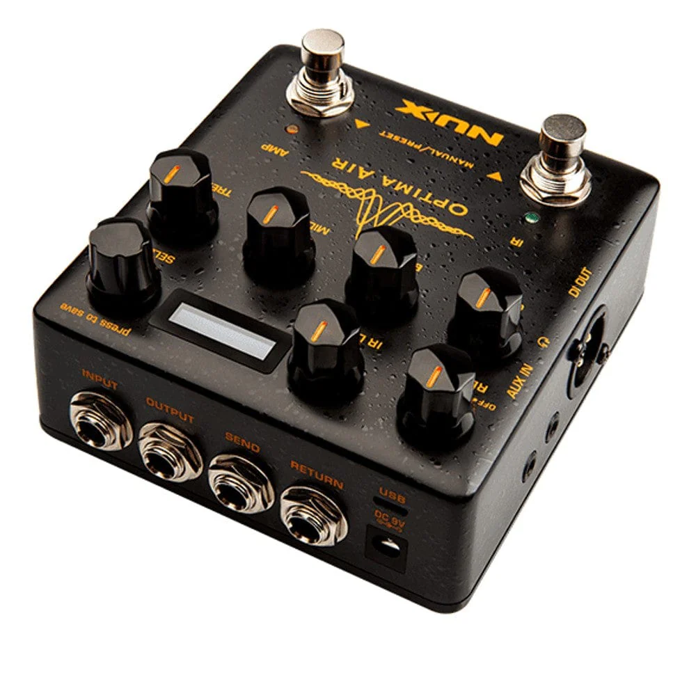 Nux NAI 5 Optima Air Dual Simulator Pedal Overview: NUX Optima Air is a dual-switch acoustic guitar simulator with a preamp for acoustic and electric guitar players. It simulates the acoustic guitar profiles with the best-optimized sound depending on your guitar and pickup type. IR loader combined with a preamp which is equipped with 3-band EQ and Gain controls. And there is an additional one-knob-control Reverb effect.