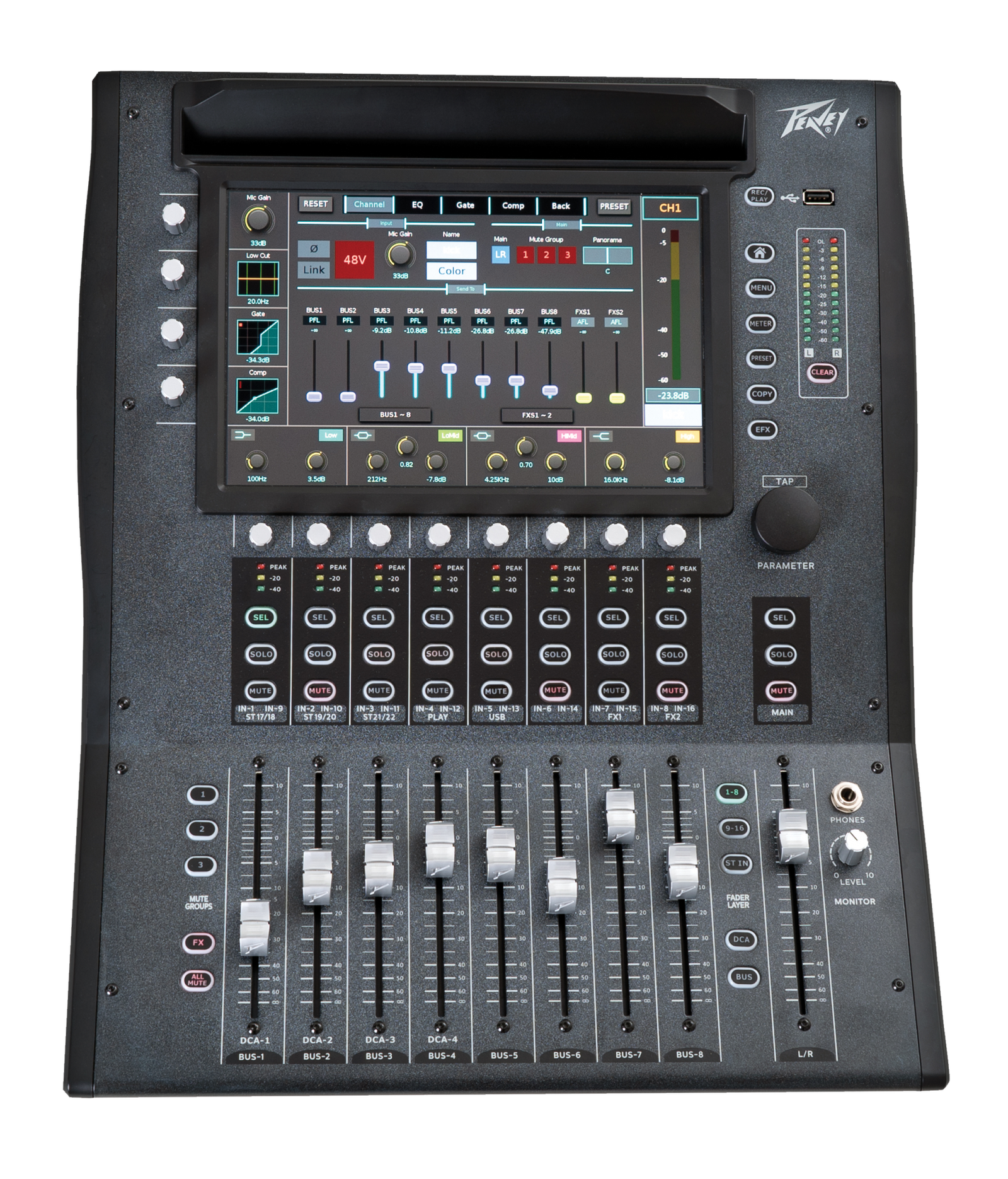 The centerpiece of the Peavey Aureus is its attractive and feature-packed 10-inch multitouch display. With a couple of taps, you can access almost every critical parameter. Need to adjust your compressor and EQ settings? No problem! Simply tap them on the channel strip and start tweaking. Likewise, you can assign channels to busses, set up FX sends, and load and save scenes! Nine high-quality 100mm motorized faders, 14 dedicated encoders, and 45 backlit buttons round out the interface, putting Aureus’s expansive controls at your fingertips. If you dread menu diving, you’ll appreciate the Peavey Aureus’s no-nonsense workflow. And, by placing a connected tablet in the Aureus’s onboard dock, you can easily expand to a two-screen system!