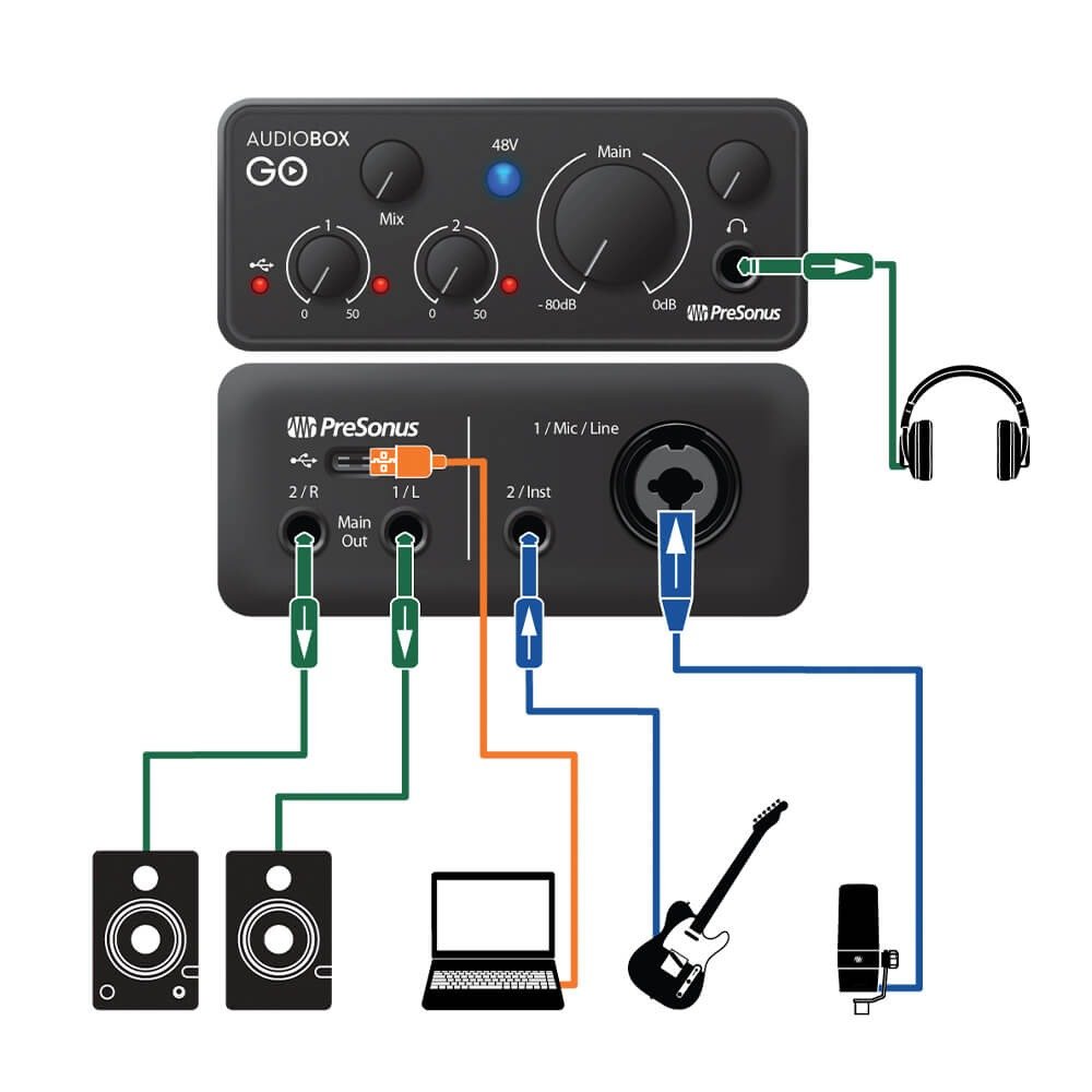 The AudioBox GO™ features a PreSonus® XMAX-L preamp, designed with over 25 years of recording-studio knowhow. Not only does it ensure that your recordings will sound clean and articulate with low noise, it also provides 50 dB of gain and +48v phantom power for professional XLR condenser microphones. The combo jack doubles as a line-level input that you can use to record keyboards, drum machines, and more! A dedicated Instrument input lets you connect an electric guitar or bass, so you can record guitar and vocals at the same time.