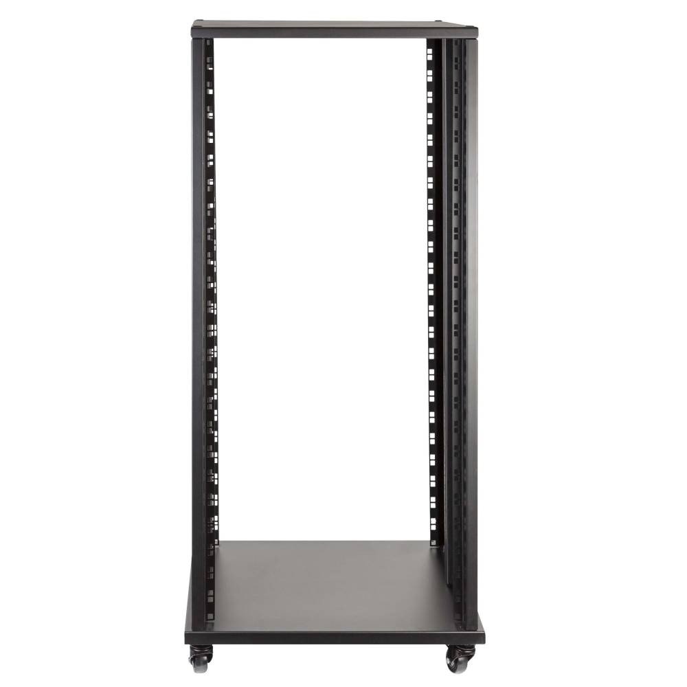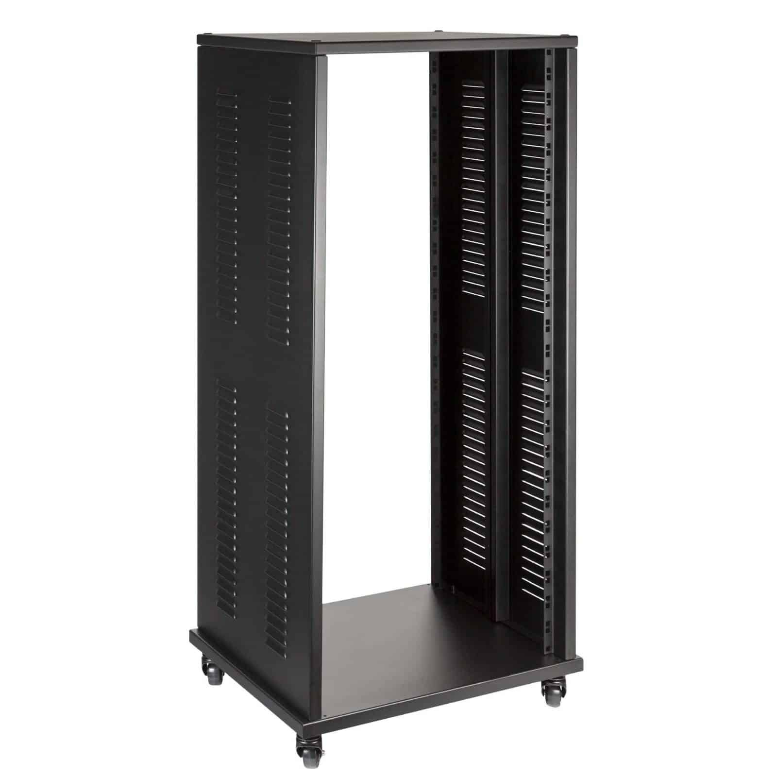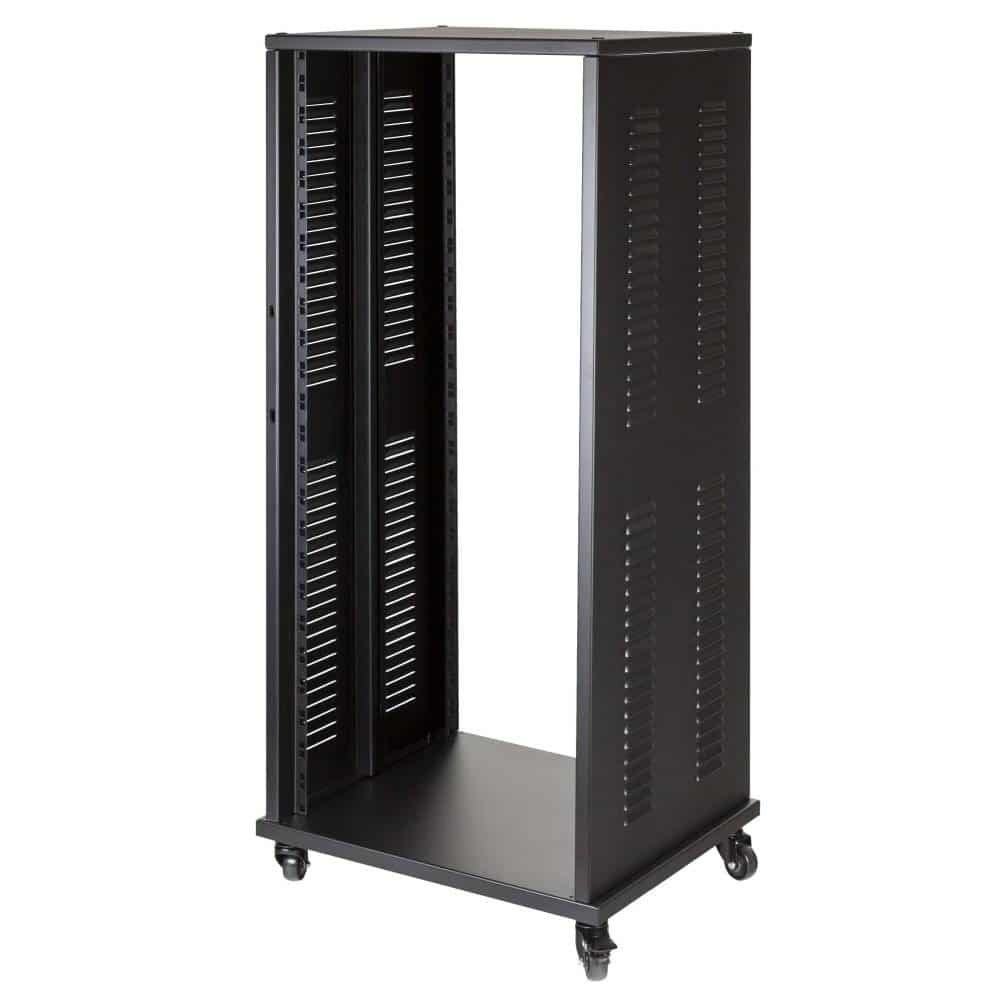 Professional steel construction standard 19” – 24U – rack stand.Featuring 4 swivel casters and 4 adjustable fixed feet. 375 mm rackable depth. Ideal for stage, recording studios or home applications.