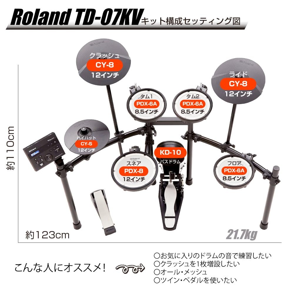 The Next Step in Your Electronic Drumming Journey Conveniently compact and ideal for drumming at home, the TD-07KV V-Drums kit delivers the superior expression and playability of high-end V-Drums in an affordable package. Roland’s original ultra-quiet, double-ply mesh heads feature across the snare and tom pads, while large crash and ride pads and a dedicated kick pad with realistic, satisfying pedal feel round out the kit. The TD-07KV also lets you explore creative opportunities that go far beyond any acoustic kit, with deep editing tools to craft custom sounds, onboard Bluetooth to play along with music tracks and lessons, USB to connect with computer recording software, and much more