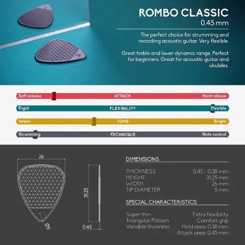 Set of 4 Picks: Includes 4 x Rombo Classic | 0.45 mm thickness for consistent playability.
