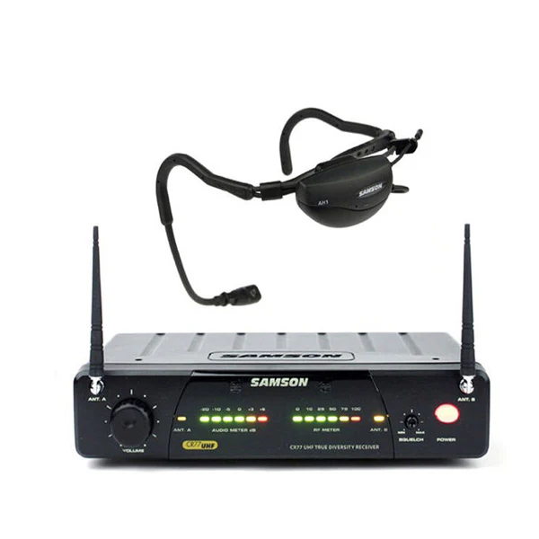 The AirLine 77 UHF Headset System offers a true wireless experience with no beltpacks and no cables, allowing complete freedom of mobility. The system includes the AH1 headset transmitter, along with the CR77 receiver.