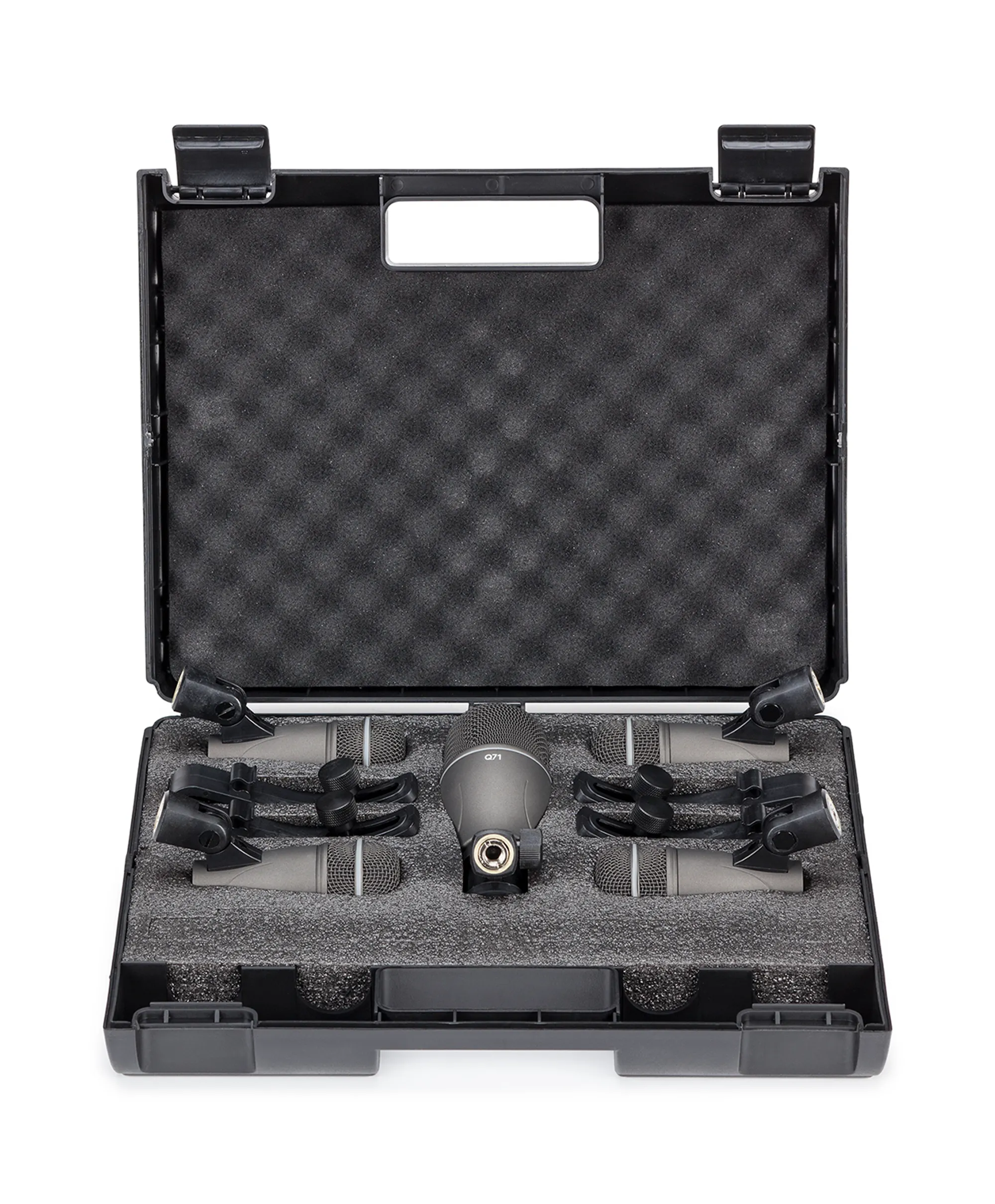 For quick and reliable setup, the Q71 is equipped with a swivel-style mic adapter, while the Q72s also include tension-mounted rim clips. A deluxe hardshell carry case provides portability and protection to the whole kit.