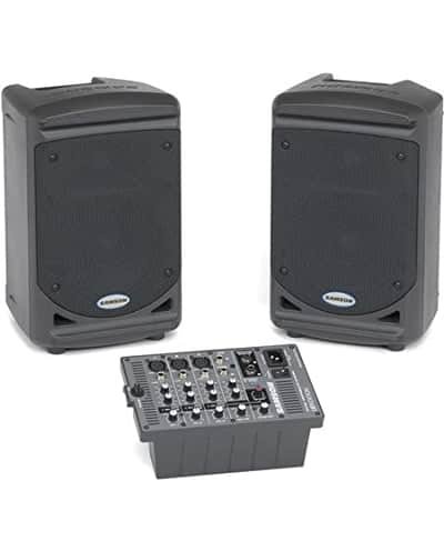 Samson Expedition XP150 Portable PA System When you pick up the Expedition XP150 portable PA system, you’re going to immediately notice how lightweight it is – definitely important for a portable PA. The second requirement, though, is clear and powerful sound. And the Expedition XP150 certainly delivers in that category. It’s perfect for small band performances, public speaking engagements, or any application where you can’t compromise sound quality for portability. When the show’s over, both speakers and the mixer fit together into an ingenious, carry-it-with-one-hand package: the Expedition XP150 portable PA system. Samson Expedition XP150 Features: