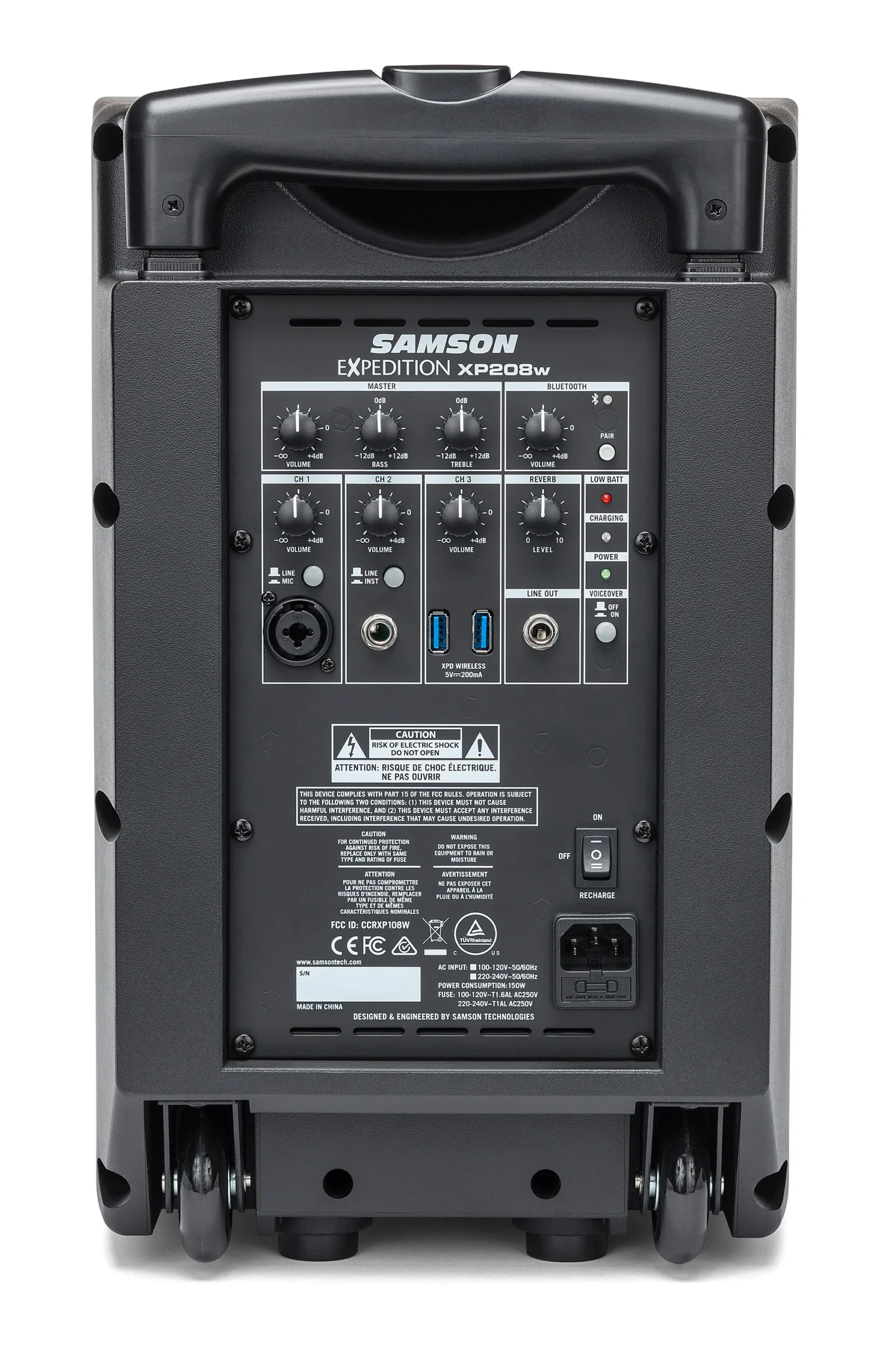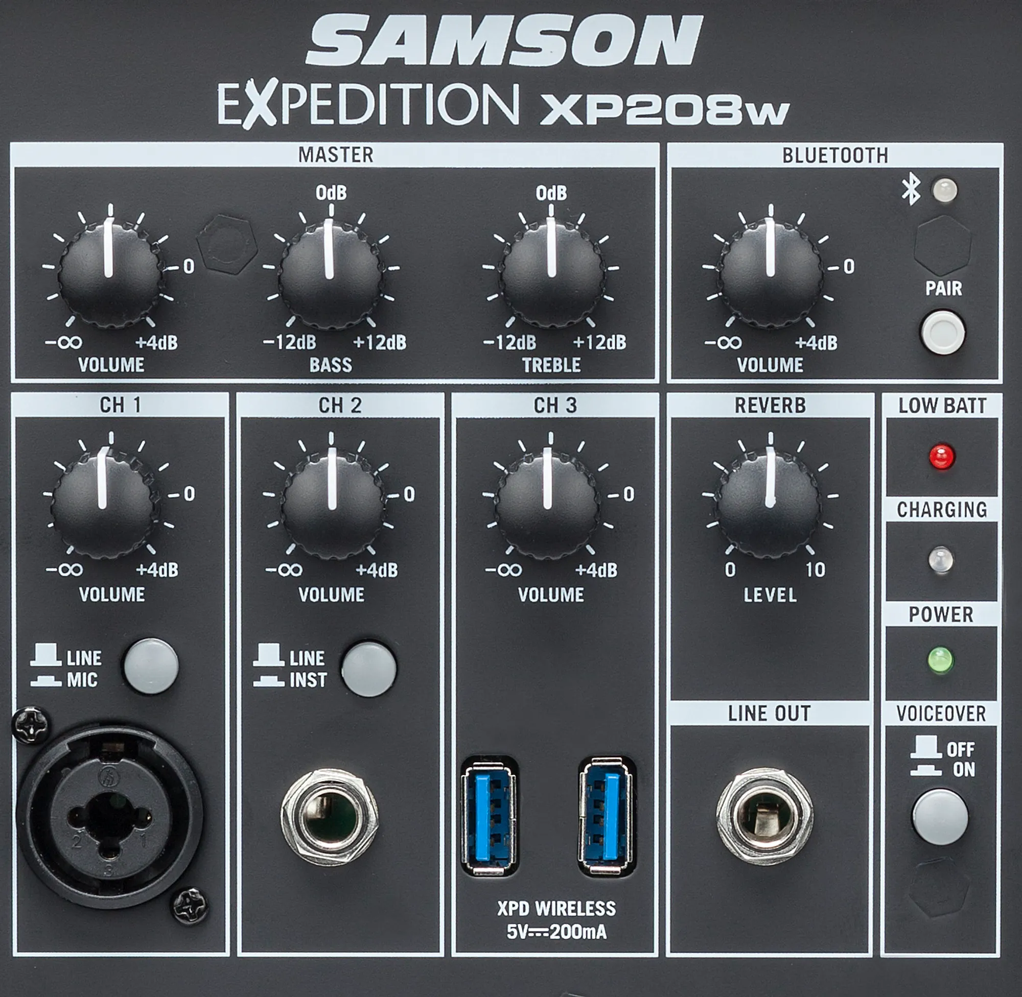 Equipped with a full-featured 4-channel mixer, the XP208w makes setup quick and easy. Connect microphones, line-level devices and, for buskers, guitars directly to the XP208w. The speaker can also wirelessly stream music from any Bluetooth device. A variable reverb control adds depth, and a voice-over ducker automatically lowers the music when you speak or sing into a microphone (XLR or wireless inputs). In addition, a master 2-band EQ is provided to adjust the tonal characteristics of the XP208w, as well as a line output for daisy-chaining additional speakers.