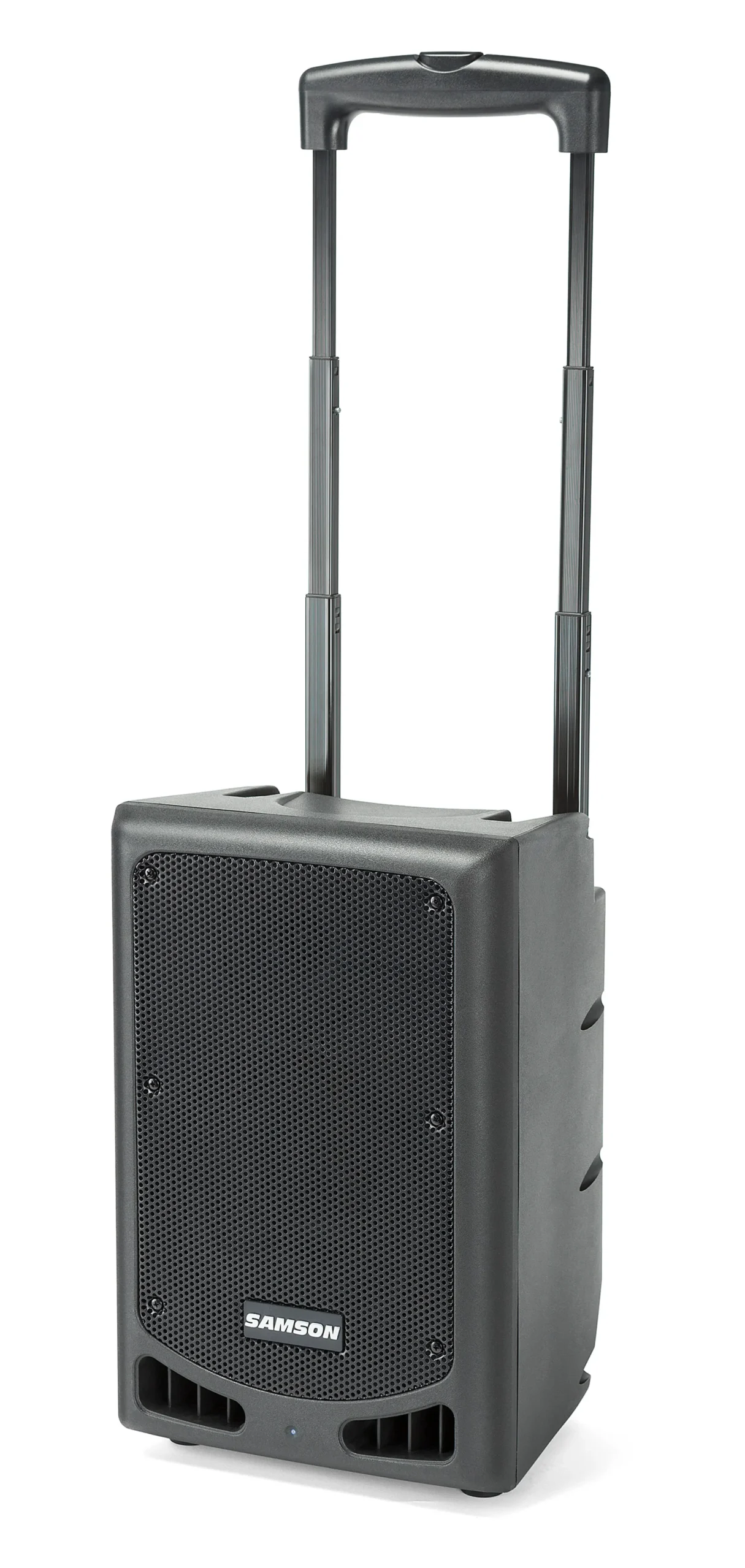 The XP208w provides up to 20 hours of continuous operation from its built-in rechargeable battery. Its lightweight amplifier delivers 200 watts of power to an 8″ 2-way speaker system. All of this is housed in a rugged polypropylene enclosure with a steel grille, locking telescopic handle, and smooth-running wheels that weighs just under 24 pounds. Needless to say, transporting the XP208w is a breeze. Plus, a 1 3/8″ speaker mount allows the XP208w to be used with any standard speaker stand.