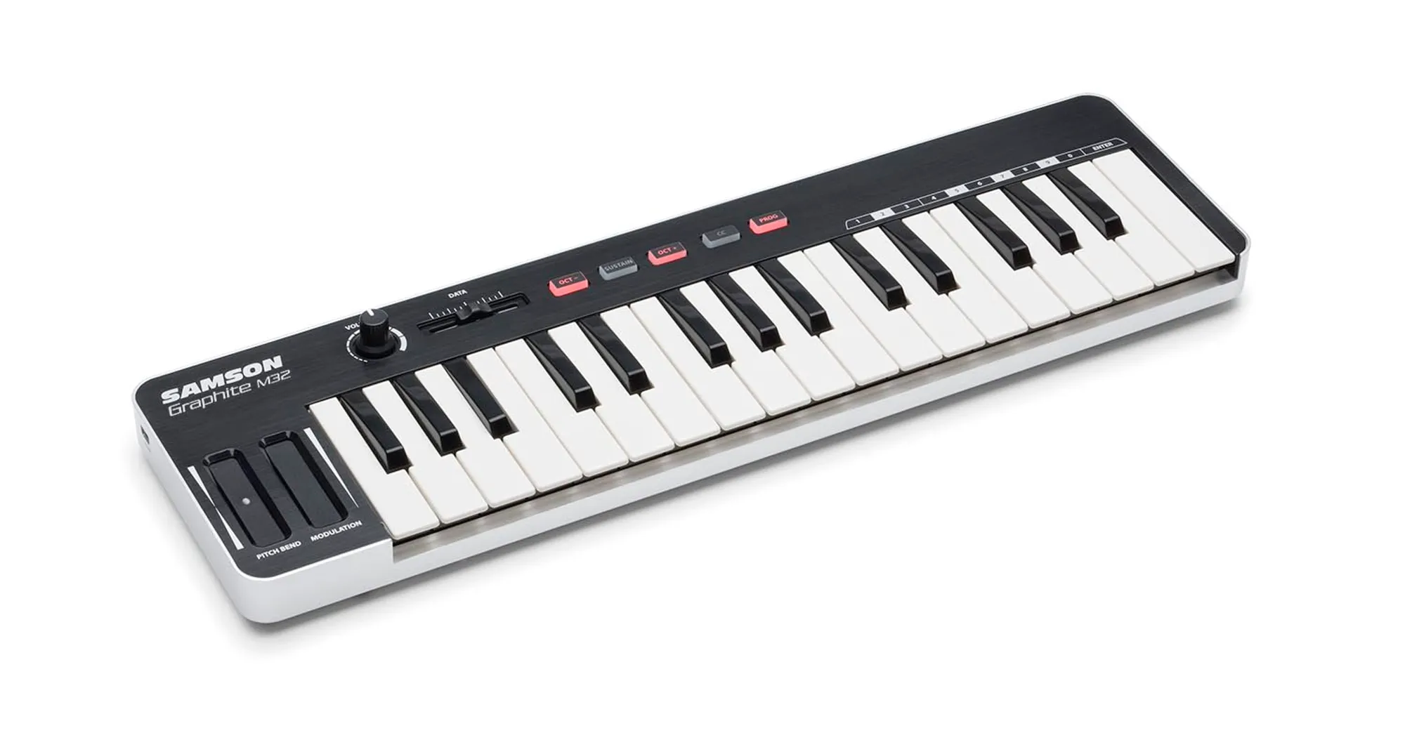 Samson’s Graphite M32 USB MIDI Controller makes home studio and on-the-go music production accessible to everyone. The Graphite M32 features a 32-key velocity-sensitive mini keyboard with a variety of programmable controls for optimal playability and customization in an ultra-portable design. And with iPad/USB bus power and plug-and-play operation, the Graphite M32 makes it easy to get the most out of your music software, no matter where creativity strikes.
