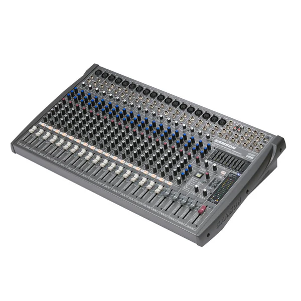 The 20 Channel Samson L2000 4 bus USB mixing console gives small clubs and gigging bands all the features of a large console, but with a small footprint and pricetag. The L1200 features several outputs: USB, 1/4″, and XLR, giving end users versatility, while features like large, backlit Mute buttons give users functionality. The Samson L2000 20 channel 4 bus USB mixing console also features: