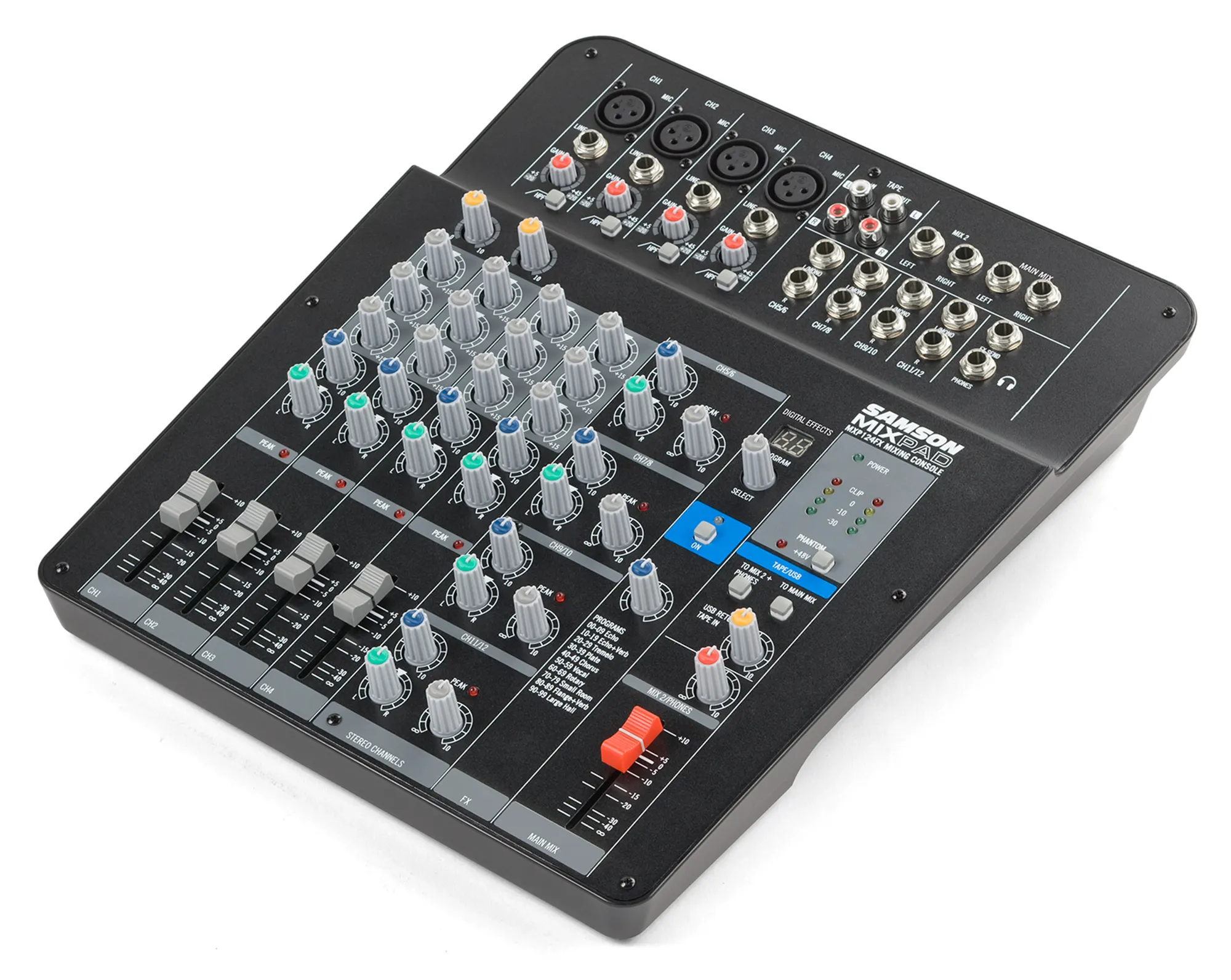The MixPad® MXP124FX is a compact, 12-input analog stereo mixer with effects and USB that demonstrates Samson’s commitment to quality, affordability and professional specifications. This lightweight mixer delivers the sonic clarity, ease-of-use, and premium performance that serious musicians demand.