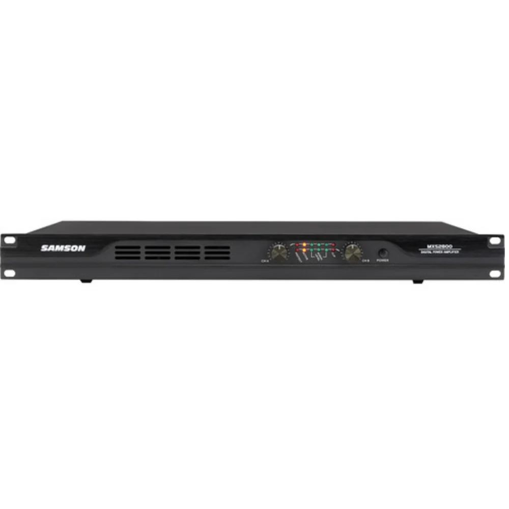 Pro Power. Samson’s MXS2800 Professional Power Amplifier is designed to deliver premium power in any sound reinforcement application that requires exceptional sound and high wattage support. Astonishingly efficient, the MXS2800 combines easy operation, comprehensive protection and impressive output levels into a small, lightweight design perfect for any live performance or installation setup. With a unique single rack space, Class D design, the MXS2800 produces 850 watts of stereo power at 4 ohms and 3,400 watts of bridged mono power at 4 ohms. The power amp also features low noise fans to ensure its high-grade power transformer has continuous access to cool air. The MXS2800 sports a sleek, user-friendly front-end design with detented level controls for each channel, as well as Signal, 10dB and Peak level LEDs for optimal use on dark stages. The amp’s back panel features both balanced XLR and unbalanced RCA inputs, while its outputs utilize Speakon® connectors. In addition, the MXS2800’s 2-position Mode selector switch allows for easy toggling between Stereo and Bridged Mono modes. Designed to support efficient and safe performance, Samson’s high-powered MXS2800 offers pro-level power solutions for live music venues, houses of worship and health clubs, as well as for mobile DJs, outdoor parties and touring musicians.