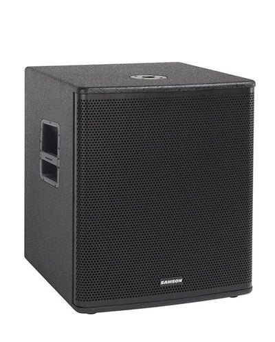 Place Of Power. Delivering 2,000 watts of heart-thumping power, Samson’s RSX18A Active Subwoofer is the low frequency solution for event DJs and bands, fixed installations and general live sound reinforcement. With a lightweight, Class D amplifier and rugged plywood cabinet construction, the RSX18A offers quick setup, maximum durability and high definition bass. Performance Versatility The RSX18A features balanced XLR stereo high pass outputs to run your satellite speakers or daisy chain with additional subwoofers. These outputs allow you to focus the RSX18A’s power exclusively on the low frequencies. Balanced XLR stereo full range outputs are also provided. Road Rugged The RSX18A is constructed of solid 9-layer plywood and features a full, perforated steel grill for comprehensive component protection. Steel side carry handles, as well as 3″ casters, are provided for quick setup and breakdown. The Punch Featuring a robust 3″ voice coil, the RSX18A’s 18″ low frequency driver brings incredible sonic depth to any sound system. The RSX18A also offers dynamic bass response that remains accurate even at tremendously high SPLs.