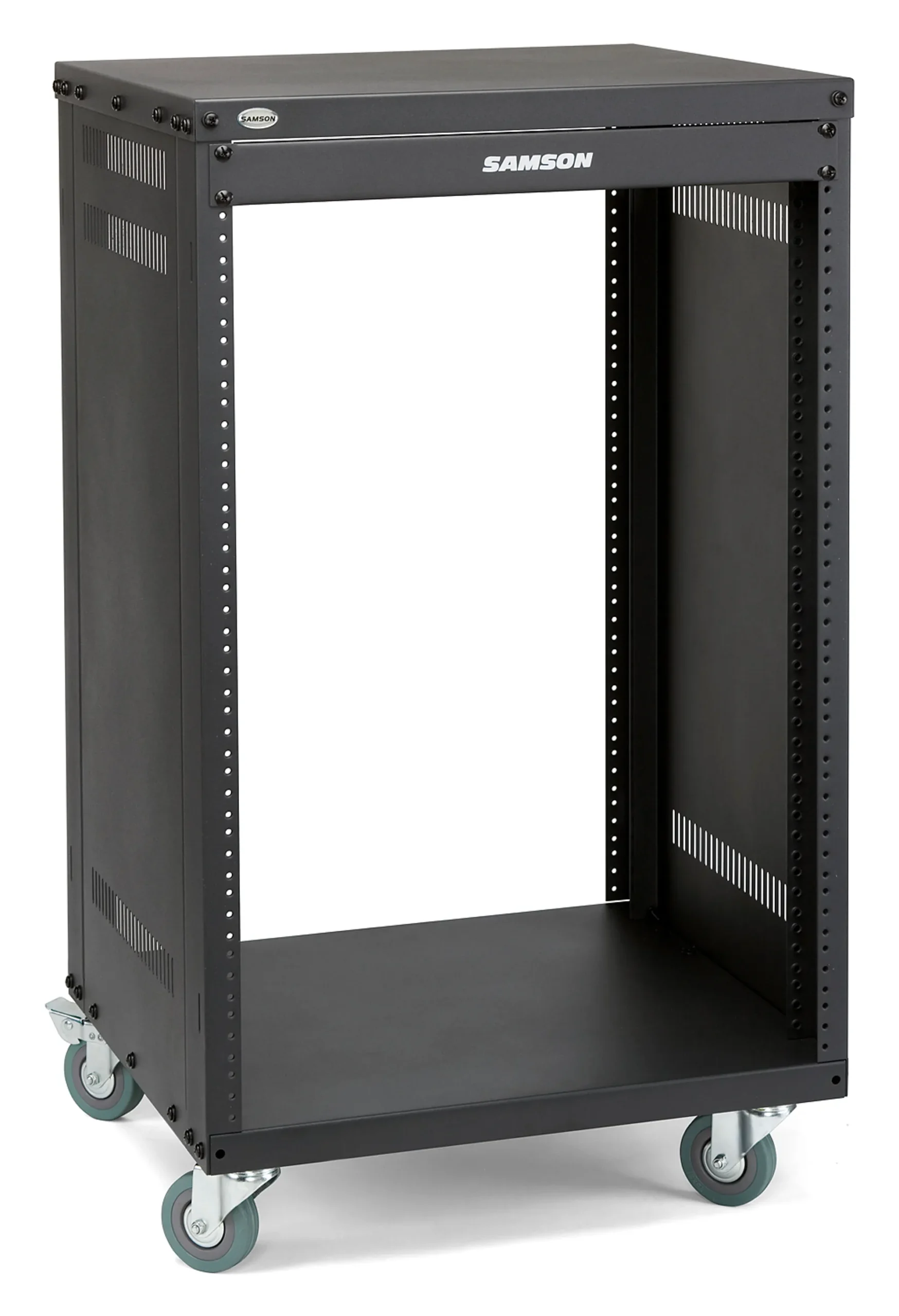 The SRK 19″ Universal Equipment Racks are available in four sizes to accommodate any rack-mounted equipment setup: 8 (SRK8), 12 (SRK12), 16 (SRK16), and 21 (SRK21). All racks are constructed of heavy-duty steel with fully enclosed side panels, as well as front and rear rack rails. The side panels are also perforated for passive ventilation. The racks are mounted on four 3″ (75mm) casters with lockable fronts that can handle a weight capacity of up to 300lb (450lb without casters). Each rack comes with a single-space blank panel. Finally, their unique steel support bar design allows these racks to be compatible with either U.S. or European thread sizes, with both sets of screws included.