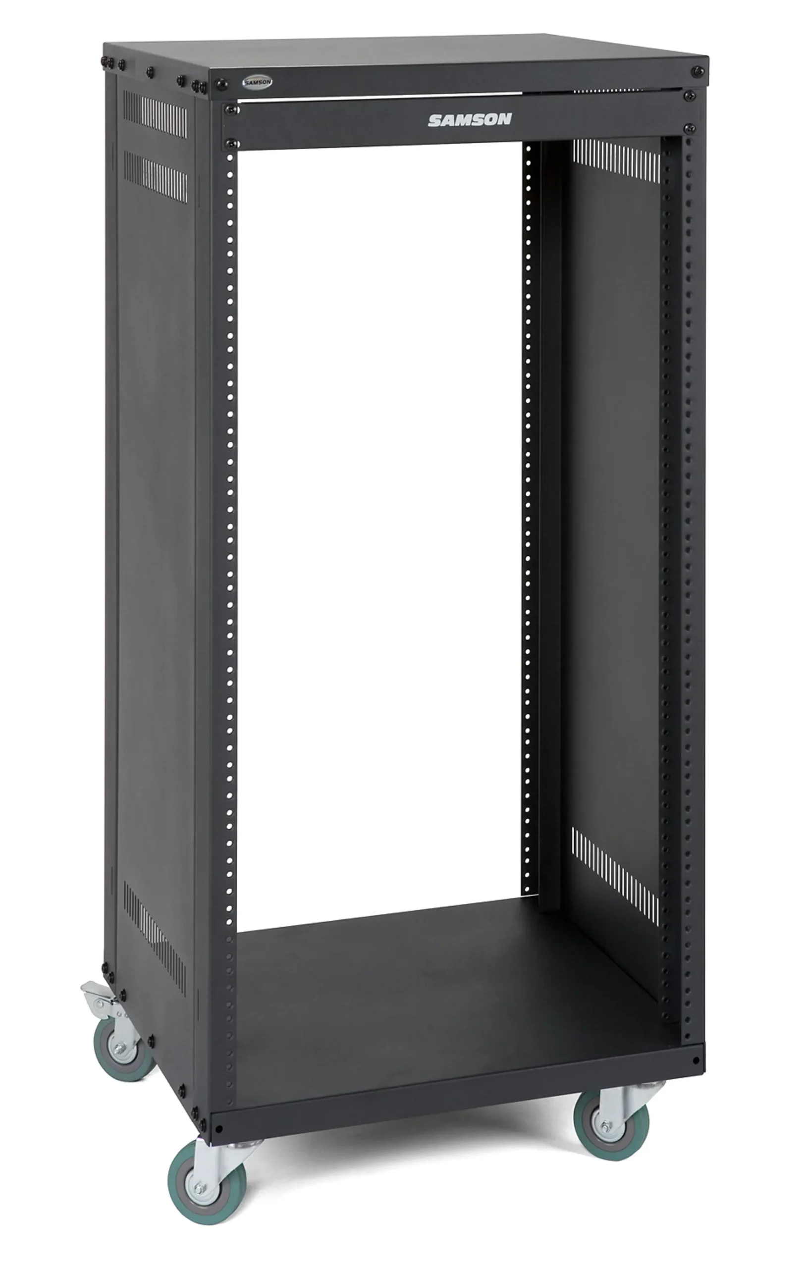 The SRK 19″ Universal Equipment Racks are available in four sizes to accommodate any rack-mounted equipment setup: 8 (SRK8), 12 (SRK12), 16 (SRK16), and 21 (SRK21). All racks are constructed of heavy-duty steel with fully enclosed side panels, as well as front and rear rack rails. The side panels are also perforated for passive ventilation. The racks are mounted on four 3″ (75mm) casters with lockable fronts that can handle a weight capacity of up to 300lb (450lb without casters). Each rack comes with a single-space blank panel. Finally, their unique steel support bar design allows these racks to be compatible with either U.S. or European thread sizes, with both sets of screws included.