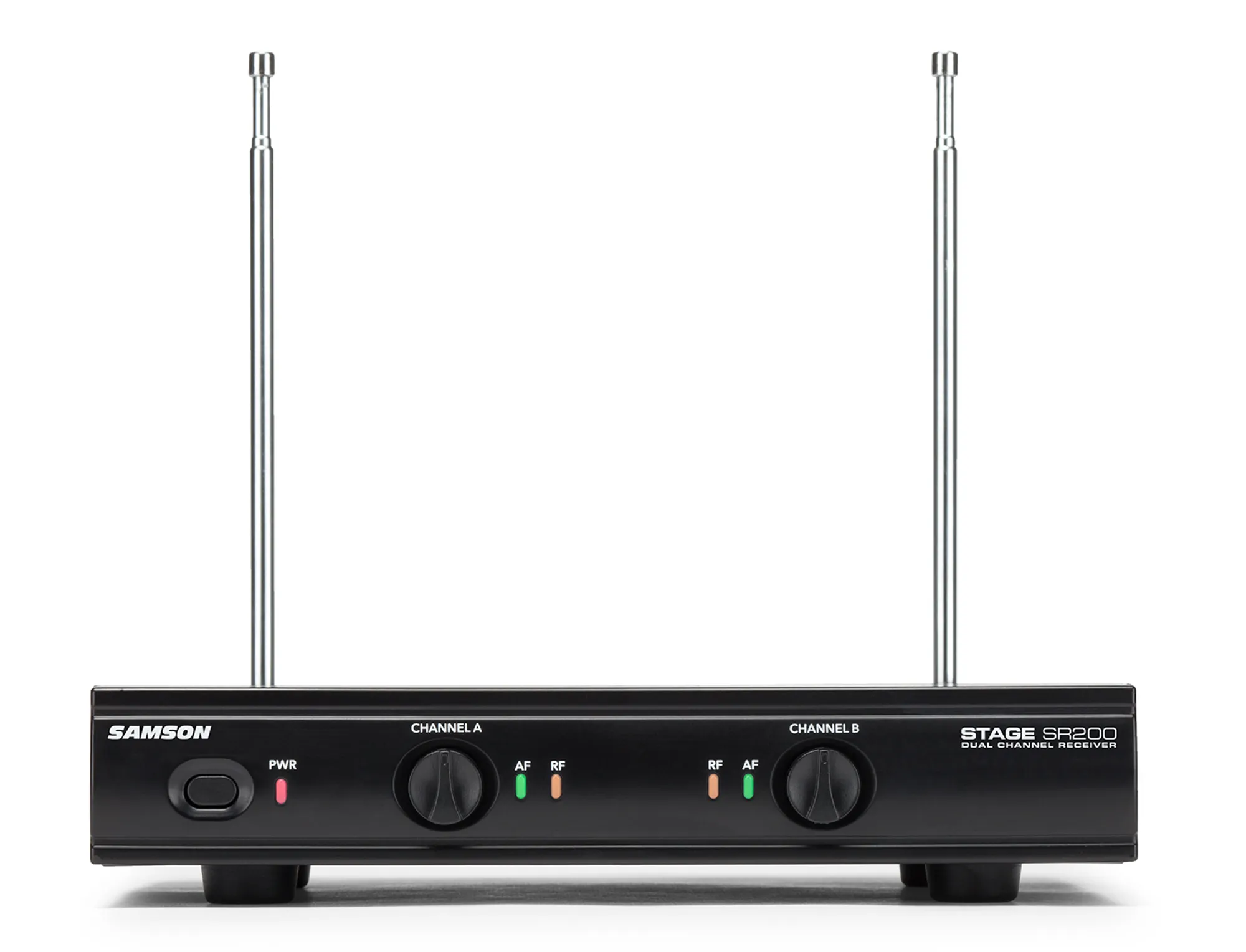 Stage 200 is a dual-channel wireless microphone system that features two dynamic handheld microphones that transmit to a single rugged metal receiver. Each handheld features Samson’s Q6 microphone element, providing crisp, clear sound and reliable VHF wireless performance for home karaoke, live presentations, education, houses of worship, and other two-person applications.