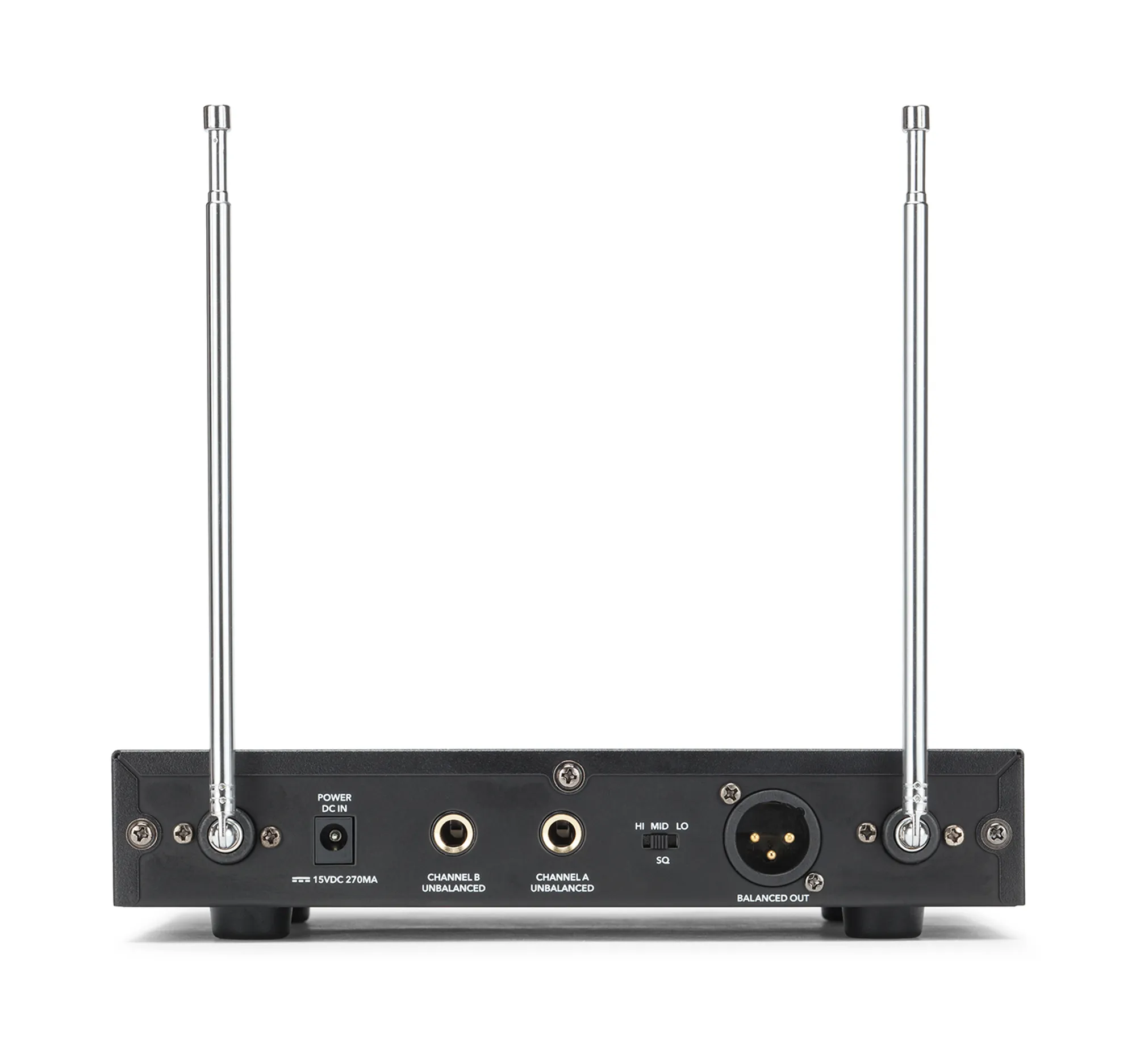 Featuring the rugged metal SR200 receiver, the Stage 200 is designed for maximum durability and versatility. The rear panel features two 1/4″ outputs and a balanced XLR output for connection to a dedicated mixer or powered PA speaker. The 1/4″ outputs send each channel separately, while the XLR sends a mix of both. Front panel volume controls on each channel let you find the perfect blend between two performers.