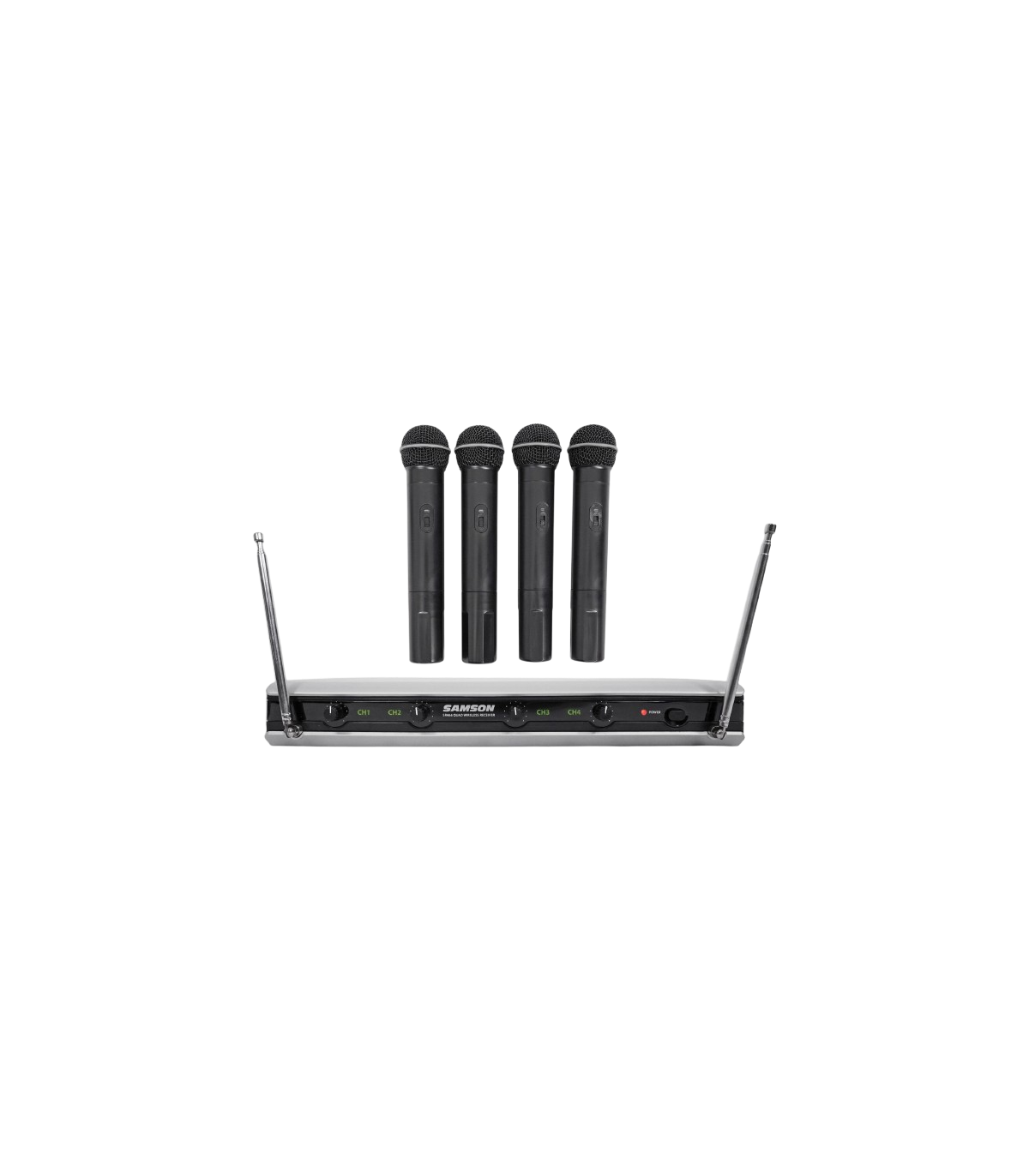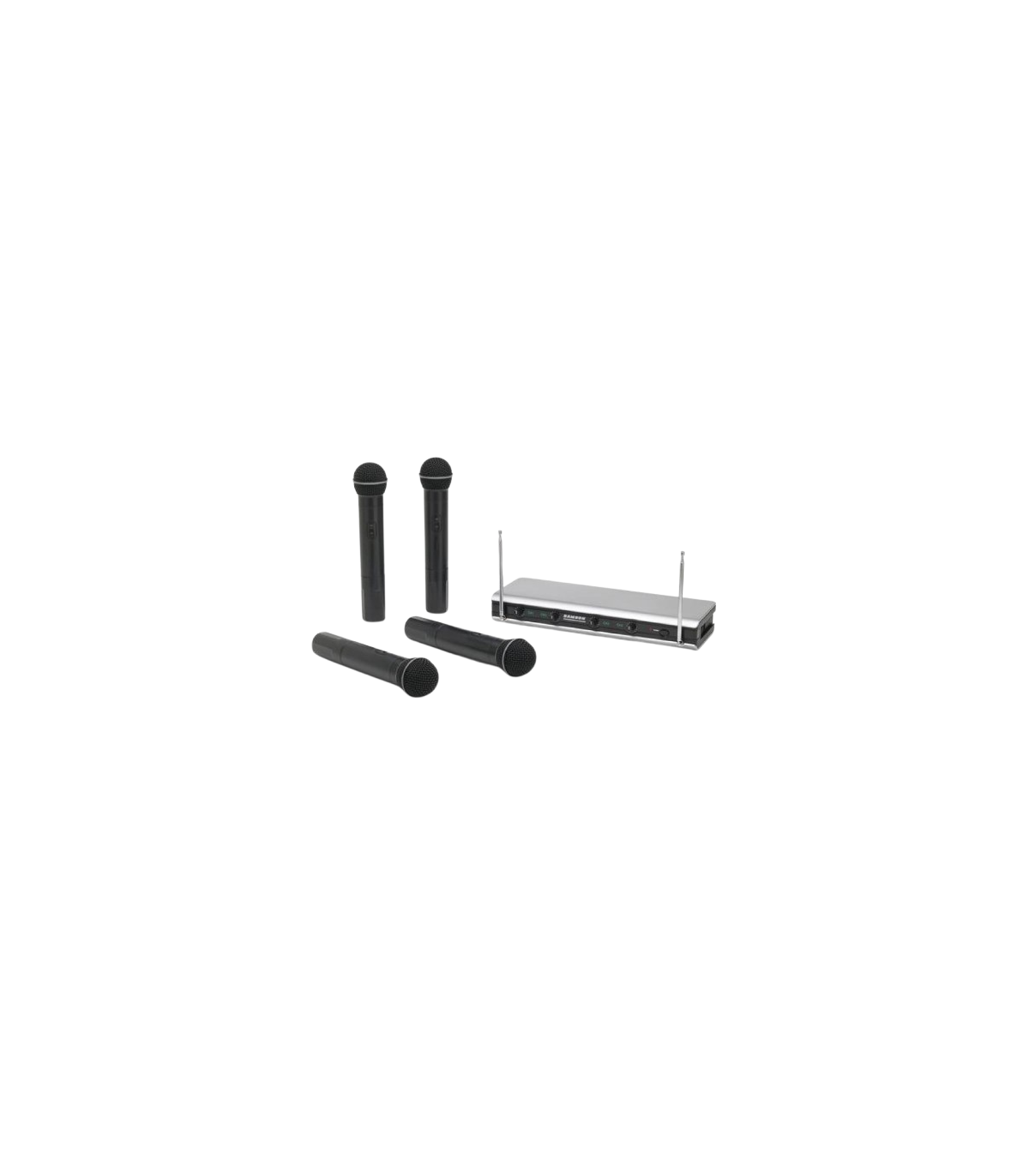 The Samson Stage 466 Quad Vocal VHF Handheld Wireless System comes with everything you need for a great performance. It includes four HT6 handheld transmitters with H6 cardioid dynamic microphones, an SR466 4-channel receiver, two 1/4″ output cables, a 1/4″ to RCA cable, four 9-volt batteries, rack ears, and an AC power supply. The transmitters are pre-set to Samson’s VHF frequencies: B1 (212.2 MHz), B2 (177.0 MHz), B3 (200.9 MHz), and B4 (195.4 MHz). Whether you’re using it for karaoke, DJ gigs, live music, or presentations in a boardroom, this system delivers reliable, high-quality sound.