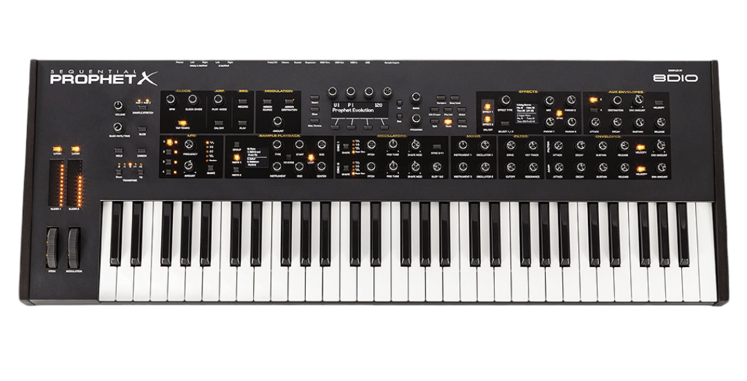 As for the samples themselves, Prophet X does it right. This 150GB sample library (created by 8Dio) comes packed with acoustic and electronic instruments, along with boatloads of cinematic and ambient effects. And that’s just the beginning. Beyond the four envelope generators, four LFOs, and deep modulation matrix, you have loop manipulation, sample stretching, and other powerful tools to sculpt your samples. Top it off with a premium 5-octave aftertouch-enabled keyboard, onboard storage, dual effects engines, a polyphonic step sequencer, and more; and you have the Sequential Prophet X: a beastly synthesizer eminently worthy of carrying the legendary Prophet lineage forward.
