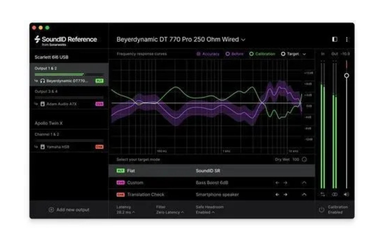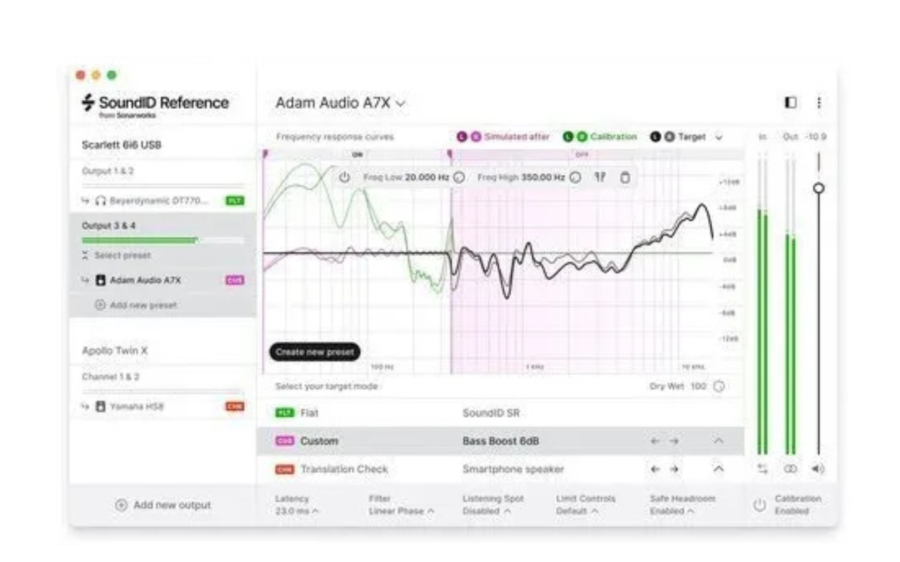 Calibrating your studio monitors with SoundID Reference for Multichannel is a piece of cake. Just connect a measurement microphone to your audio interface, fire up the software, and you’re good to go (microphone sold separately). It comes with more than 400 ready-to-use headphone calibration profiles, so tailoring the software to your headphones is even easier. SoundID Reference for Multichannel’s calibration profiles create a target frequency response that’s flat across all audible frequencies. This calibration software also allows you to make custom, real-time adjustments to the target curve for profiles that are tailored to your individual application. And since you can save as many profiles as you’d like, switching between different speakers, headphones, and rooms is 100% seamless.