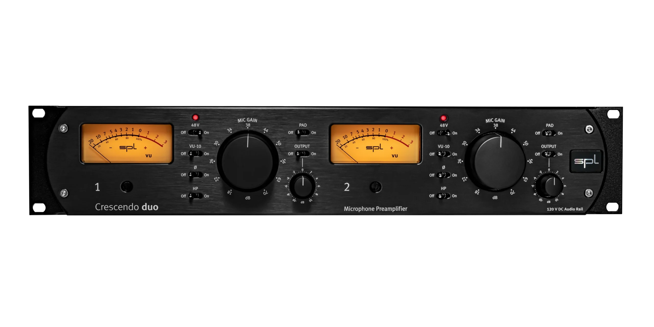 Crescendo duo is a dual-channel microphone preamplifier with 120V technology.