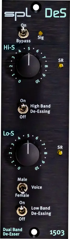 The SPL DeS extends this principle by employing two frequency bands that may be utilized separately or concurrently. Using two de-esser steps improves effectiveness while reducing audible artifacts. High and low bands provide more accuracy and more concentrated sibilance processing. The input signals are automatically modified to provide consistent processing at all times. A Male / Female mode option adjusts the processor’s frequency response to the usual male and female vocal frequencies.