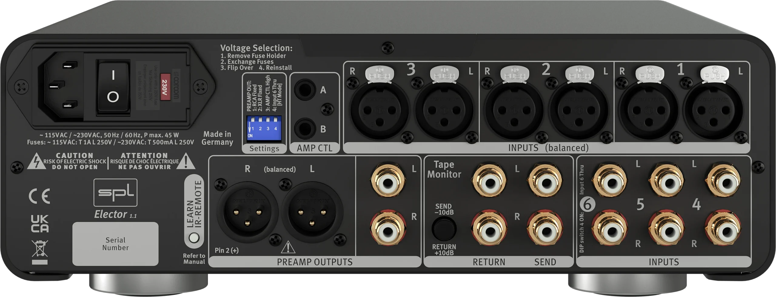 The Elector offers three pairs of balanced inputs with XLR jacks and three standard inputs with gold-plated RCA jacks.