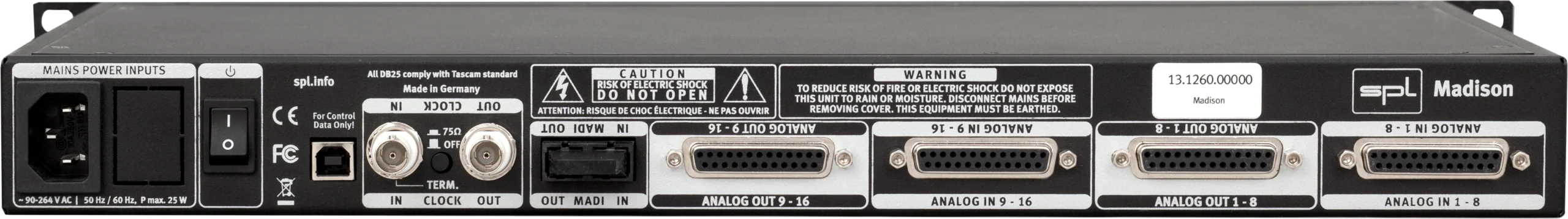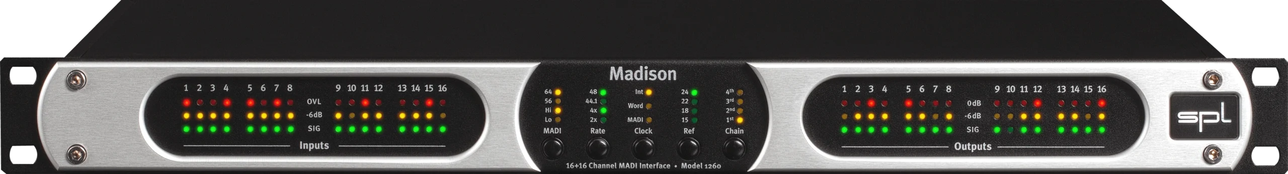 With 16 input and 16 output channels in a single rack area, the Madison combines signal conversion with dependable clock and MADI processing. And, as a real SPL device, it is meant to be simple to use, expandable, and, of course, a great-sounding conversion system.
