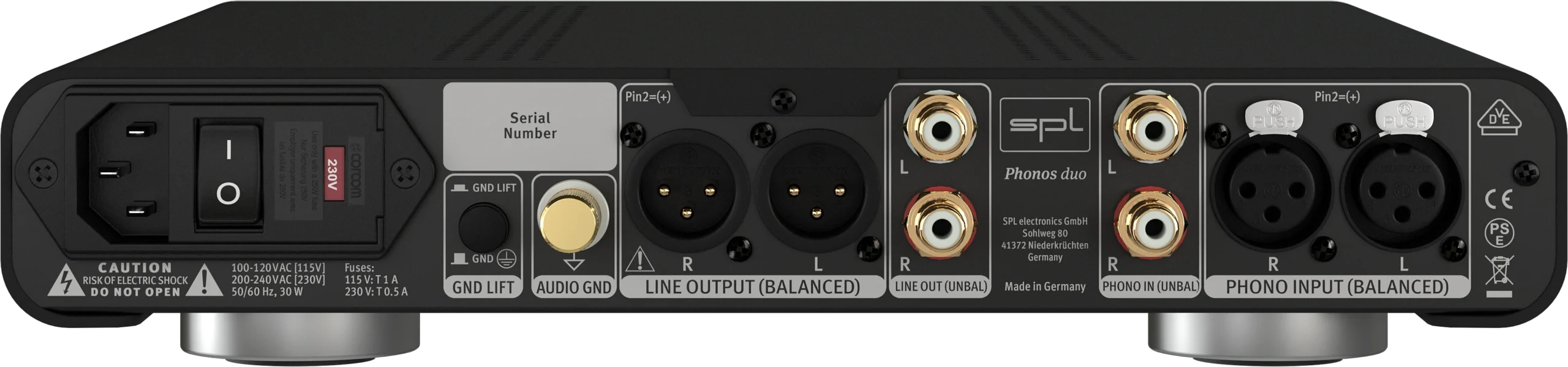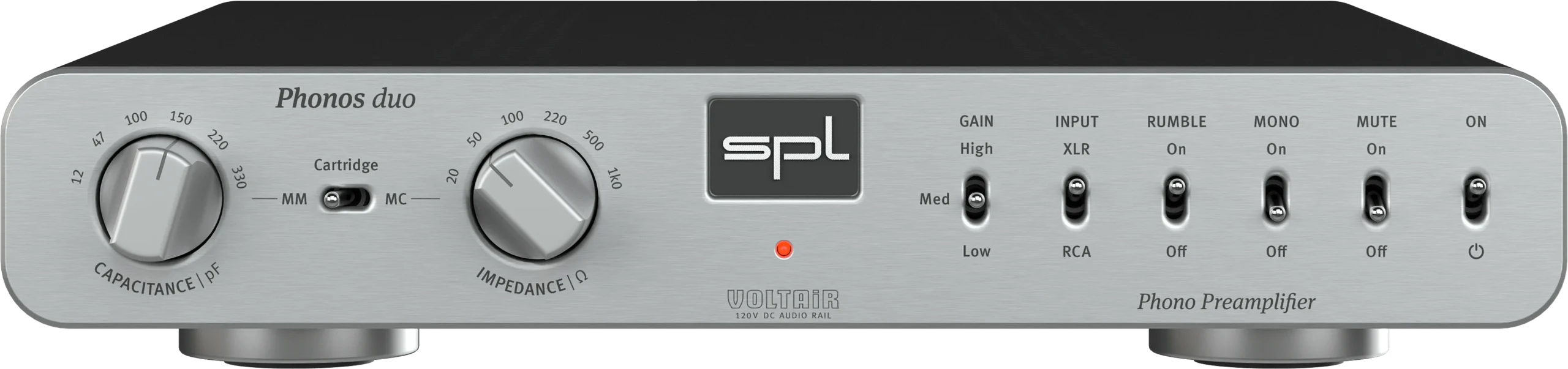 The very low output voltage makes preamplifier design a challenge, because it has to be pre-amplified extremely noise-free. With up to 70 dB preamplification, Phonos duo offers one of the most powerful phono preamplifiers for moving coil systems. Thanks to SPL 120V technology, Phonos duo amplifies extremely low-noise, linear and phase-locked.