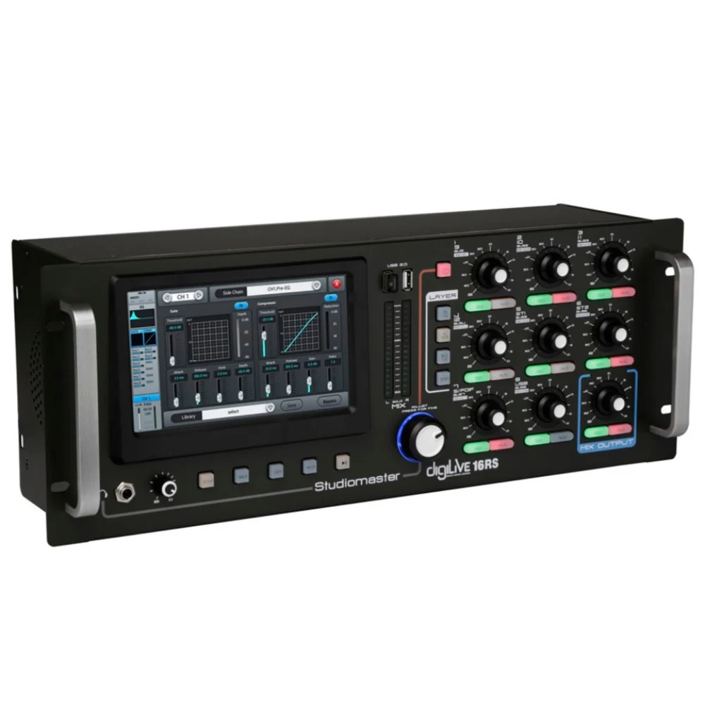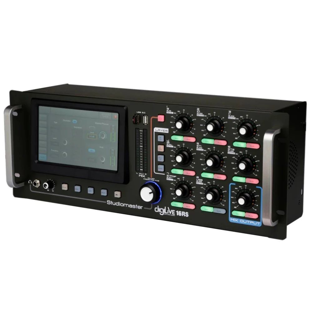 The Studiomaster DIGILIVE 16RS is a 16-channel rack-mount digital mixing console designed for live sound, installation and compact studio use. It features 12 mic-/line channels plus stereo inputs, a 7″ high-resolution touchscreen, iPad control, full digital processing with 16 internal busses and ultra-flexible routing, making it ideal for pro audio clients seeking compact powerhouse mixers.