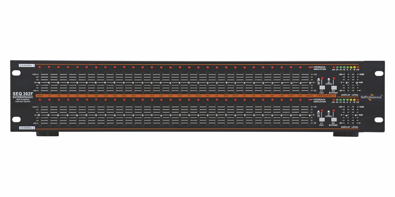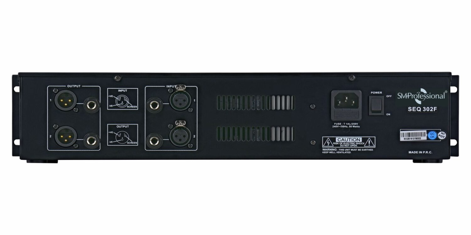 The Studiomaster Professional SEQ 302 F is a Dual 30 band stereo graphic equalizer with Feedback detection system.