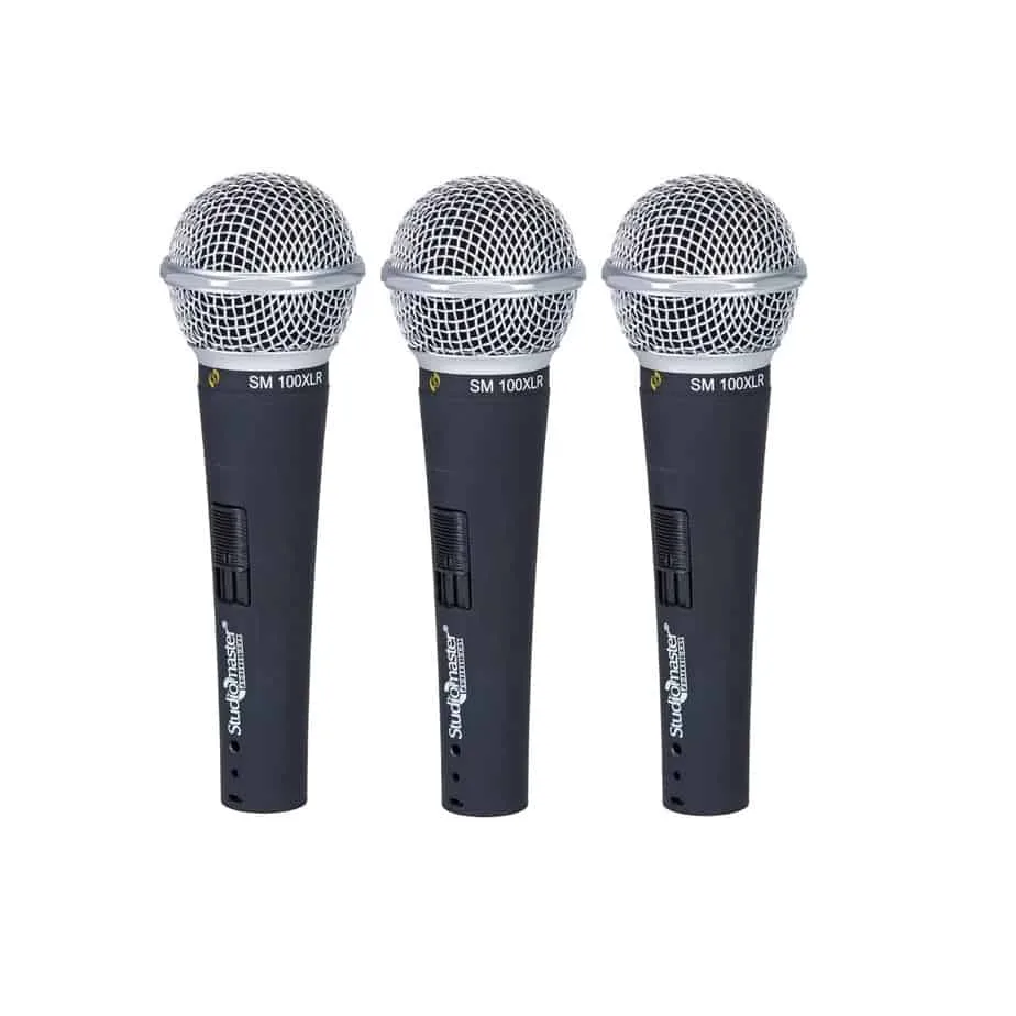 The Studiomaster TRIO 100 Dynamic Microphone (Pack of 3 SM 100XLR). The Studiomaster TRIO 100 is a high-quality dynamic Microphone. The Studiomaster TRIO 100 is a Pack of three SM 100 XLR’s. These high-quality microphones have a frequency response designed for speech, vocal & instrument miking.