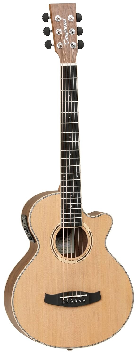 Tanglewood recognise that to introduce people to music an instrument must have a high build quality, good playability, attractive cosmetics and as many features as possible to encourage and reward aspiring musicians. Using this design brief, Tanglewood luthiers created the Discovery Exotic series, a whole range of genuine musical instruments which feature 4 band EQ systems with stage backlighting, delicate 2mm fingerboard dots, black soft touch machine head buttons and understated sound hole rosettes. All these features are aimed at bringing the specification of a much more expensive instrument into the entry level market. Our newest Discovery Exotic model is the cutaway travel model DBT TCEBW, based on our best selling Black Walnut instruments but scaled down to a perfect travel ready size. We select the finest Himalayan Spruce for our tops and marry that with American Black Walnut timber to give the perfect blend of style and substance. Each instrument is carefully braced for a warm and rich acoustic tone and we fit an onboard EX4 EQ system for players who need studio or stage compatibility.