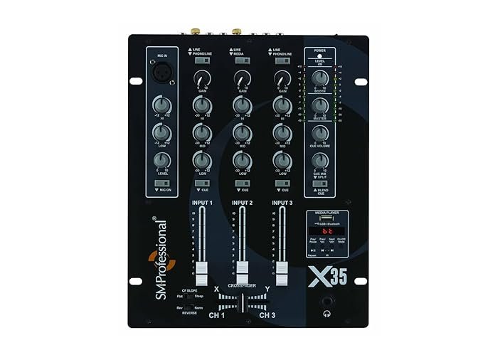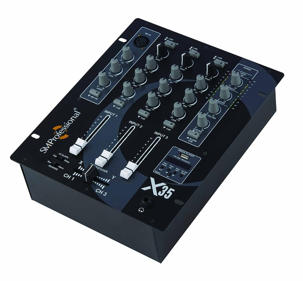 The X 35 is a 4 channel DJ mixer with a built-in USB MP3 media player & Bluetooth, 3-band kill EQ (-30 dB) and a wide variety of inputs and outputs to let you mix in style.